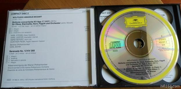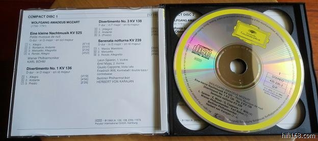 伯姆指挥的莫扎特小夜曲等,这应该是DG最早的小双张了,2CD,德版全银圈无码,CD1非常好,CD2播放面有些小划痕,CD1的齿掉光,无法固定,CD2的齿也掉了一些但可以固定,这种盒子比较特殊,前后两面打开,有这种盒子的朋友可以买回去换个盒子。60元。