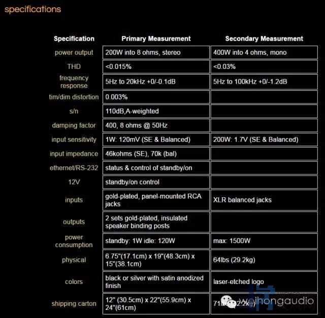 功能混合真空管/晶体管设计,有一个特别挑选的6922真空三极管。12只高速MOS-FET输出晶体管,没有整体的反馈。Switch-selectable偏压,设置8 -或4-Ohm操作。XLR和RCA两组输入端子。远程控制:电源开/关。