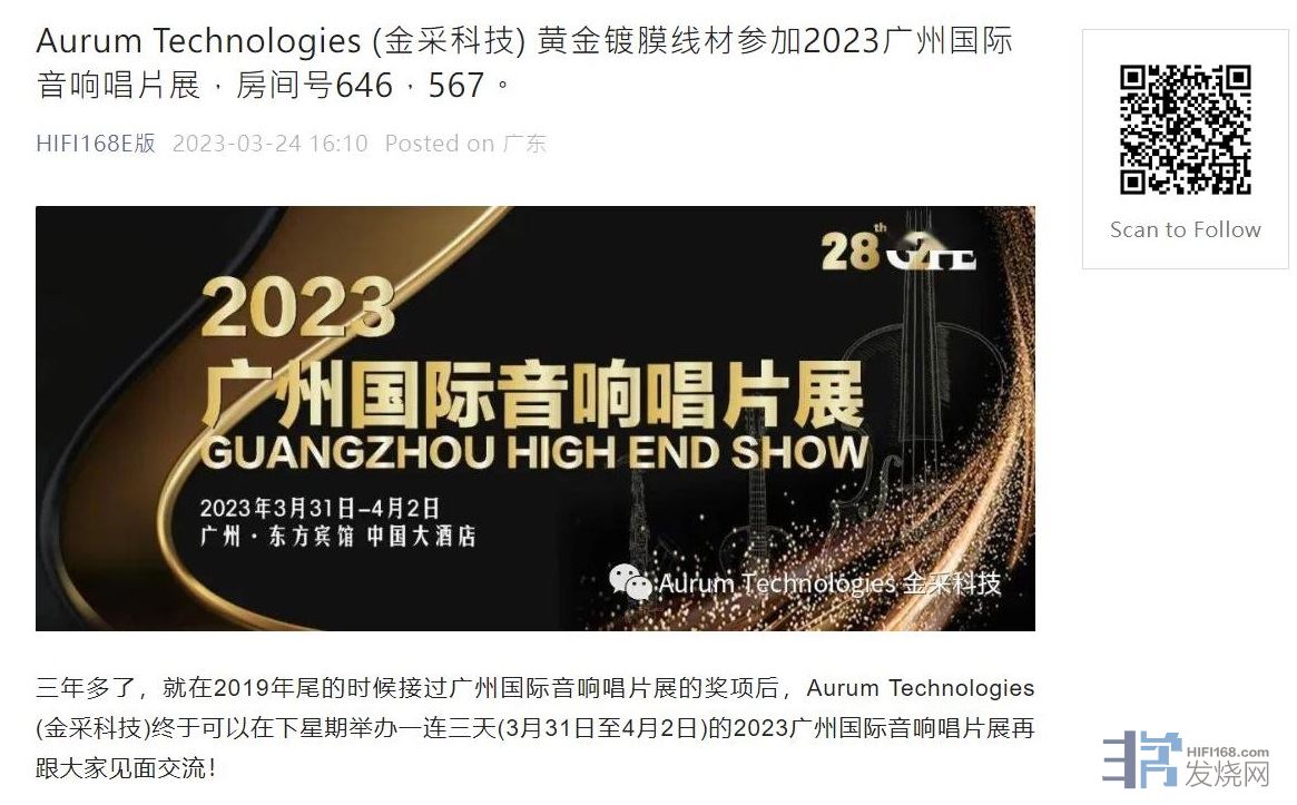 Aurum Technologies (金采科技) 黄金镀膜线材協同美国Sound Lab参加2023广州国际音响唱片展,房间号567,646。https://mp.weixin.qq.com/s/B1lHbYDNK7EKZM4Db1ogKQHIFI168E版 2023-03-24 16:10 Posted on 广东