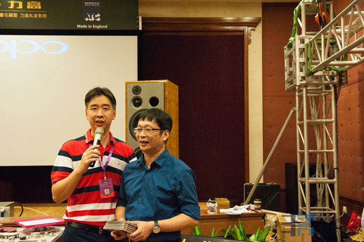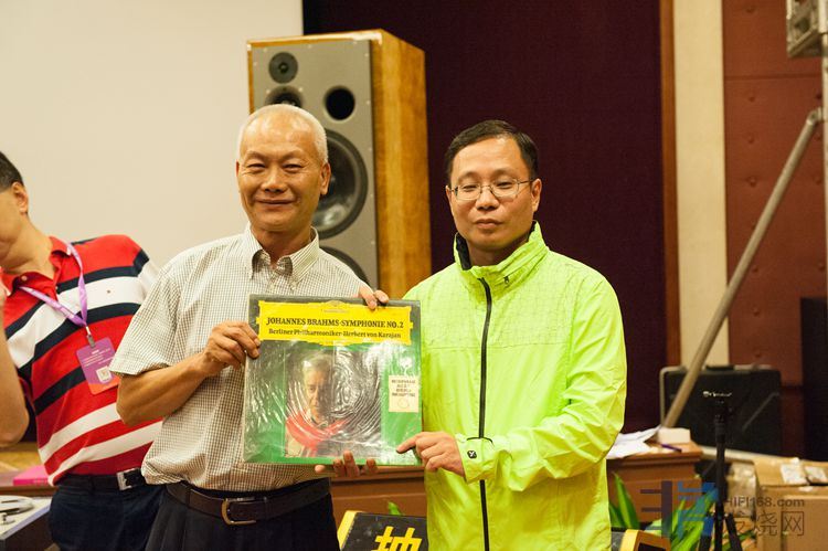 HIFI168版主们,图一左起W版,第二个是KEN版,第三个是邝版主,送出的特别奖今年广州音展的限量500张黑胶唱片给多年来为网友聚会辛苦的ANN,图二是E版主。