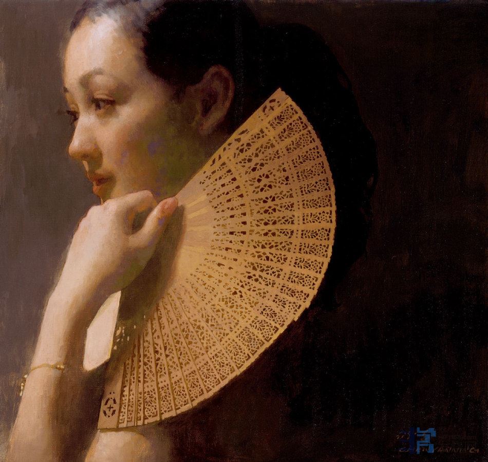 他创作的“檀香扇(sandalwood fan)”系列油画,运用强烈的虚实对比,大片黑把背景虚化,而少女的头、手、扇身则用最实的线条刻画。檀香扇面薄如蝉翼,剔透玲珑,花纹—片片层层相叠凸现音乐感,画家把无限对称的重覆线条寓含在一个精雕细缕的半圆里,形成一种东方的节奏。