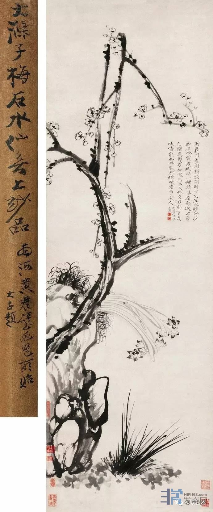 中国的写意花鸟画从南宋梁楷、法常始,致明代的林良、沈周、唐寅等得到长足的发展。尤其是明代陈淳、徐渭,更是没有墨守成规,而是另出机杼,影响了一代又一代,绘画史上有“青藤白阳”之说。到了石涛,又开辟了一个新天地,独树一帜,花鸟画继承和吸收了前人各家的优长,演化成自己即拙又见巧,“尚法”又“尚意”,大智若愚,大巧若拙的风韵。突破了旧程式,在似与不似之间发展了笔墨技法。这在当时以“四王”一统天下的书画艺术界,是非常新颖大胆的创新。石涛不仅在山水画上、在花鸟画上、人物画上的创作都取得了卓越的成就。花鸟画代表作《牡丹竹石图》,牡丹花和墨叶都摇曳生姿,姿态各异,犹如姿色艳丽的美人于峭石旁翩翩起舞,于无法中有法,直抒性灵,潇洒隽朗,天真烂漫,清气袭人,讲求诗情与画意的结合生发,别具一格,开拓了作品的意韵。