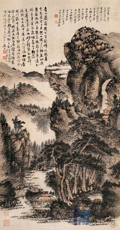 石涛的山水绘画是灵活多变的,本人喜爱石涛的山水画,尤其喜欢《游华阳山图》和《古木垂阴图》。《古木垂阴图》即有自己的技法又沿袭有元王蒙的技法,皴法采用了披麻皴,卷云皴,折带皴,加之圆浑厚重的苔点,墨色滋润、浑厚而通透,用笔线条爽快淋漓,皴法洒脱自如,笔法灵活多变,墨色层层积墨,颜色上也只用了少量赭石,然而却并不显单薄而独有浑厚沉稳。画中近景四棵虬劲的古木,四种树种,四个造型,形成互相呼应之式,没有一丝造作,古拙中体现了自然美,线条的流畅美,有枝繁叶茂的舞动,也有枯枝张扬的伸展,各不雷同,姿态奇崛!潺潺的溪流岸边嶙峋的怪石衬托着远处突兀的大山,右侧中部不忘添加几户人家的房屋,显得异常和谐宁静,隐隐约约的小桥流水呼应着远山朦朦胧胧的山林,和近处的一组古木一起,气韵之生动,让人流连忘返!这是“澄怀味象”的大境界,这是“神与物游”大情怀!两幅图都充满着宁静美,都是自然与精神的合一。