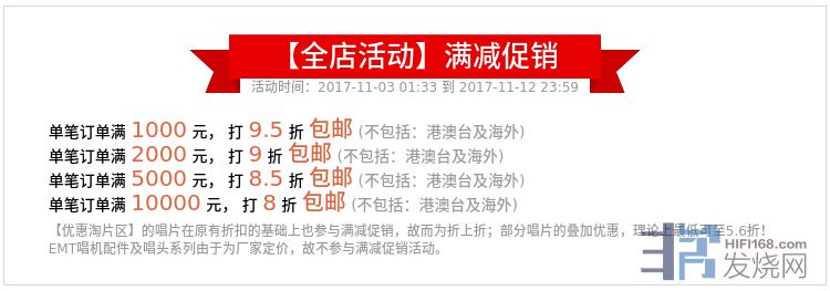 [size=5][color=#ff0000][b]双11唱片优惠酬宾,时间为即日至11月12日晚上,店内所有唱片均参与满减促销活动。原先店内优惠淘片区的唱片更为折上折优惠,最低可至5.6折!折后价格超过1000元,即免国内顺丰邮费!欢迎大家选购!下图为具体优惠幅度:[/b][/color][/size]
