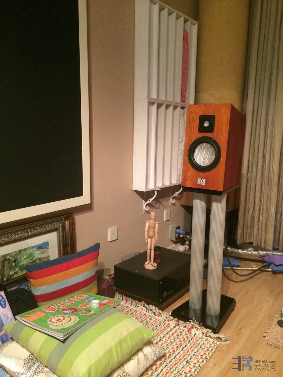 左右音箱旁墙上的黑色物体是吸音棉,吸音棉会有效降低音场高度,半反弹+半吸收的效果较好
