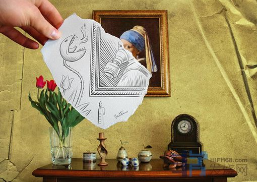 他在普通的相片中拼贴自己创作的3D铅笔画,两者结合勾勒出一幅幅脑洞大开的场景。