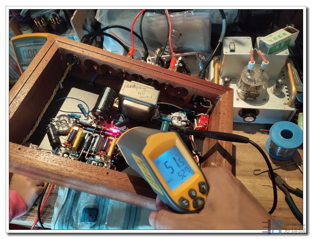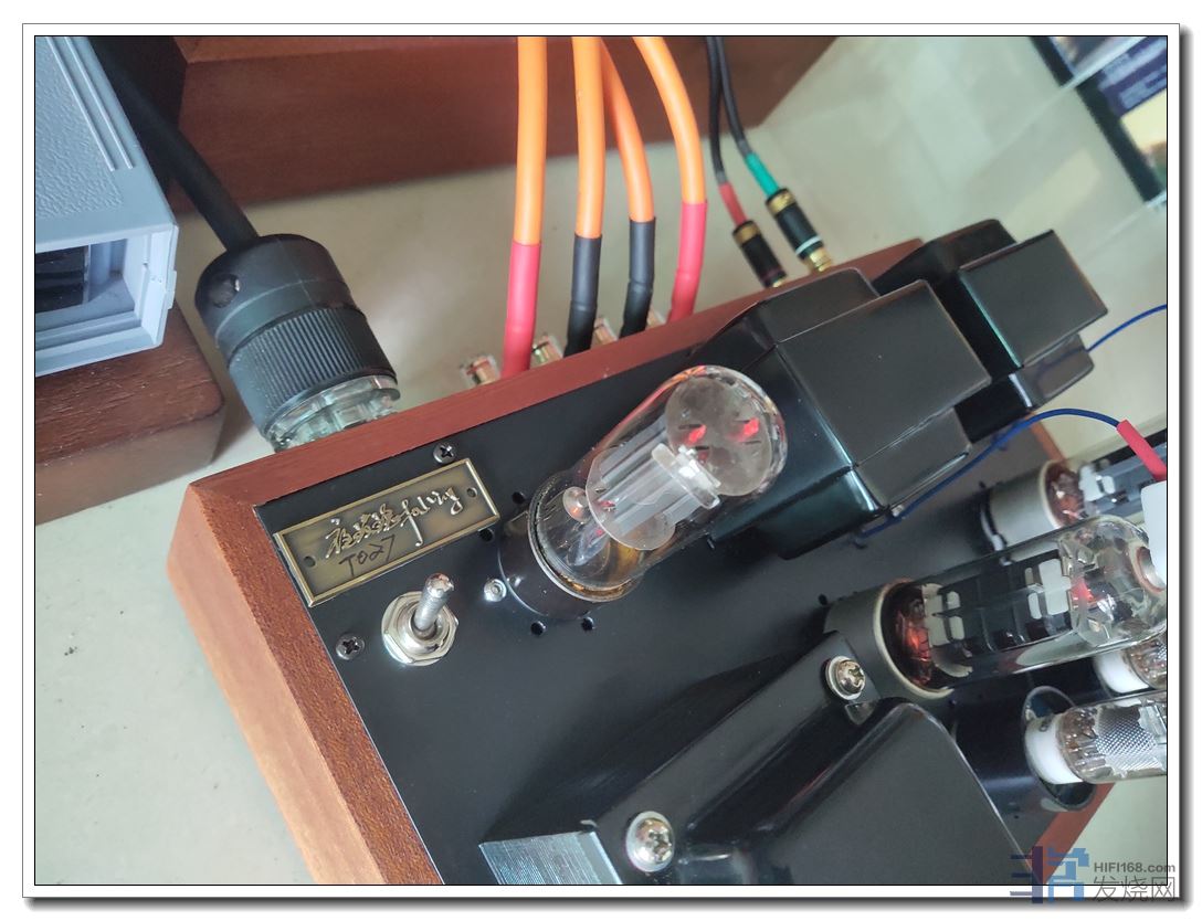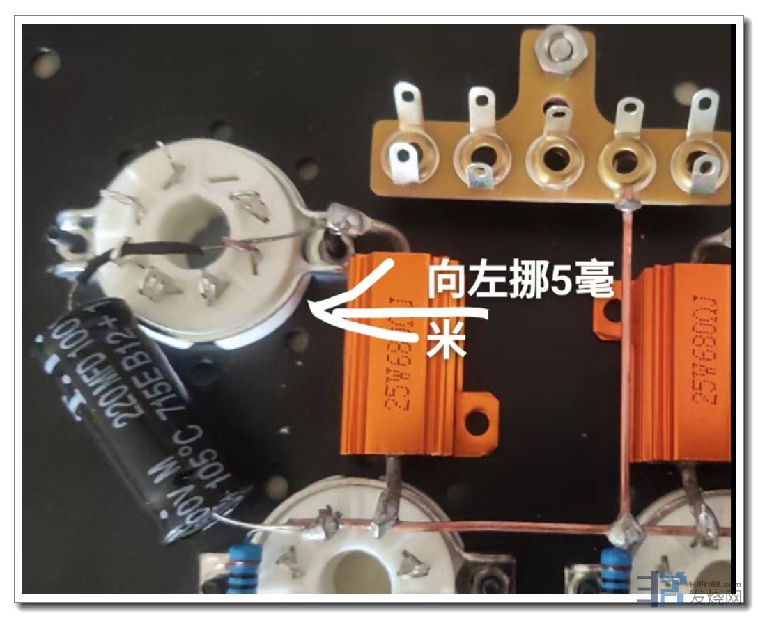 第二是将两只后级阴极电阻间距扩宽了1厘米左右,从而装上了两只性能优异、尺寸也较大的前级退耦电容。效果是底噪纹波直接降至1毫伏,耳朵要贴近喇叭上才听得到轻微底噪。