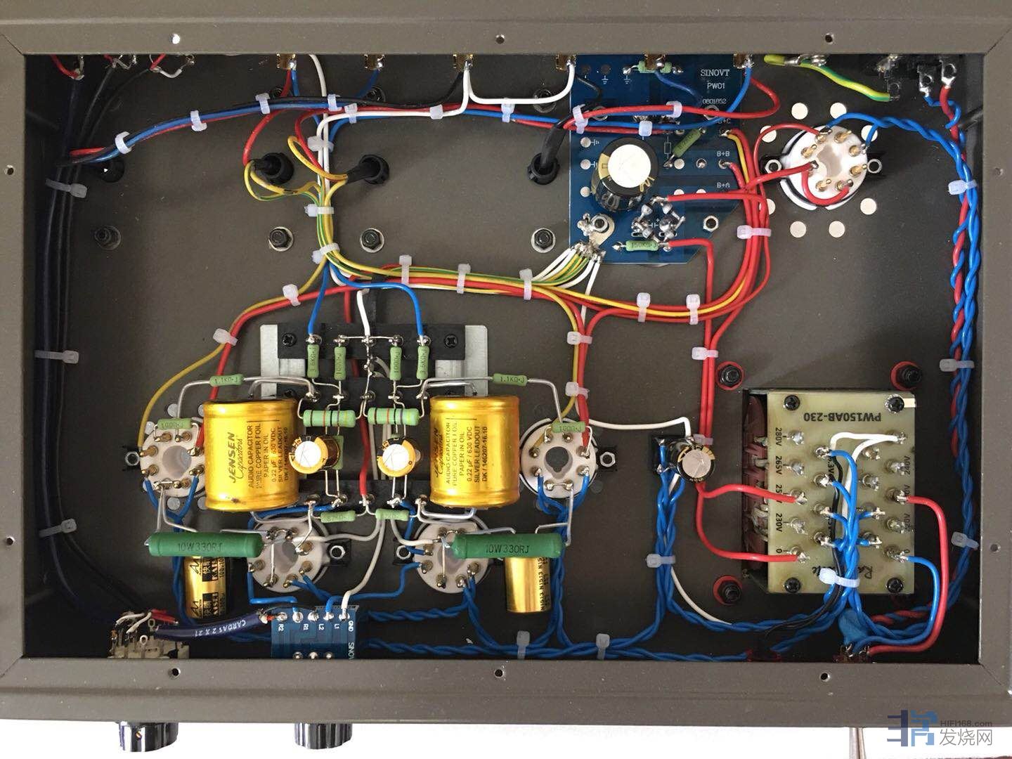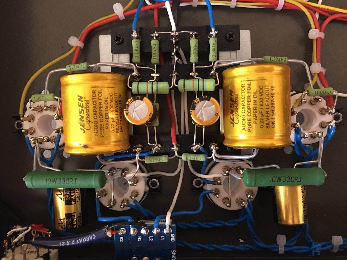 去年10月做了台300B胆机,意犹未尽,打算再做台6L6单端甲类胆机。想到上次加工机箱的艰辛,这次买了拉菲尔6SQ7推6L6套件。机箱、牛、胆管用套件的,其余的都换掉。电路略做了修改,6SQ7灯丝改直流供电。高压整流用德律风根3A整流子,高压和灯丝滤波用AudioNote STD,阴极电容用AudioNote 快晴。耦合用Jensen 铜铂铝管,电阻用金威,管座用Eizz瓷座,CD输入用卡达斯信号线,机内走线用0.5和1平方纯铜镀锡线(这个线很好,好友给的,用在十万元级某国产胆机上的),全部使用卡达斯含银焊锡焊接。做好后用Spendor S3/5和享声A200试听,声音舒服、柔和有胆味。噪音极低,耳朵贴在喇叭上只能听到很微弱的!