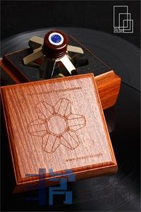 采用多種材料的複合結構,避免單一材料對震動效果抑制不佳,中間是石墨,主體是昂貴的特殊銅合金胚料切割,再施以鍍金工藝,底部的脚座是黃檀木實木切削。實木外殼,由越南當地手工製作后再運抵國内,頂部的Logo標也使用了滴膠工藝。最初的原點是什麽?就是家裏原來的那個木内和夫唱片鎮,日本Harmonix Million TU-812,價格是兩萬大元,這款片鎮在黑膠界有一個頭銜,叫“天下第一”,因爲實在太昂貴了,老葉斥重金購入也非常滿意,但是,能不能更好呢?