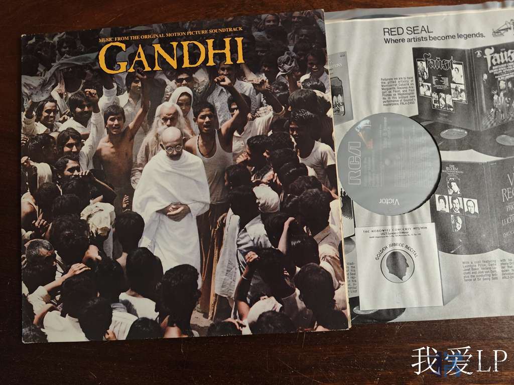 11361,电影《Gandhi(甘地传)》配乐大碟,印度音乐大师拉维.香卡等创作,融合了西方编曲与印度传统音乐元素,整部配乐不仅烘托了史诗感,也深刻呼应了甘地非暴力理念的崇高与悲壮。RCA美国头版,NM,230