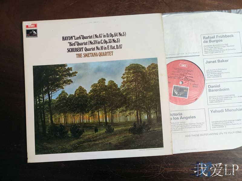 8210,罕见名盘,海顿《第67(云雀)弦乐四重奏》、《第39(鸟)弦乐四重奏》,舒伯特《第10号弦乐四重奏》,斯美塔那弦乐四重奏团。EMI英国无圈彩色邮票狗头版,NM-(如新!仅强光下勉强可见极其虚弱内袋痕),270