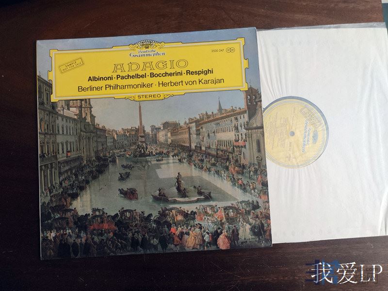 9429,经典名盘《柔板》(第2辑),包括阿尔比诺尼《G小调柔板》、帕赫贝尔《卡农与吉格舞曲》等4首经典慢板抒情乐曲,卡拉扬指挥柏林爱乐乐团。DG德国头版,标签有样板盘贴纸,折叠封套内附精美彩页DG公司唱片介绍,NM,230