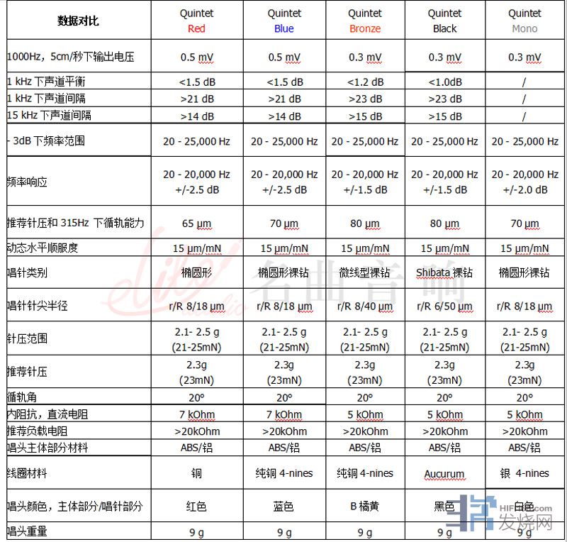 高度风Ortofon五重奏系列动圈唱头数据对比