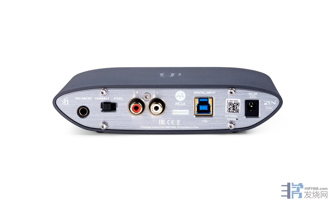 从左往右分别是4.4mm平衡的输出(可以接功放或有源音箱),可调/固定开关(ZEN DAC作前级使用时,设置为‘Variable (可调)’时,可控制耳机或前置放大器音量。设置为‘Fixed (固定)’时,则音量不可控制。),RCA模拟输出和USB(兼容3.0和2.0)输入,还有一个小小的“MQA兼容”标记,以防您忘记可以流式处理您的潮汐大师!最后则是一个升级电源的输入口(额外使用低噪音电源适配器可获得更好的性能)。