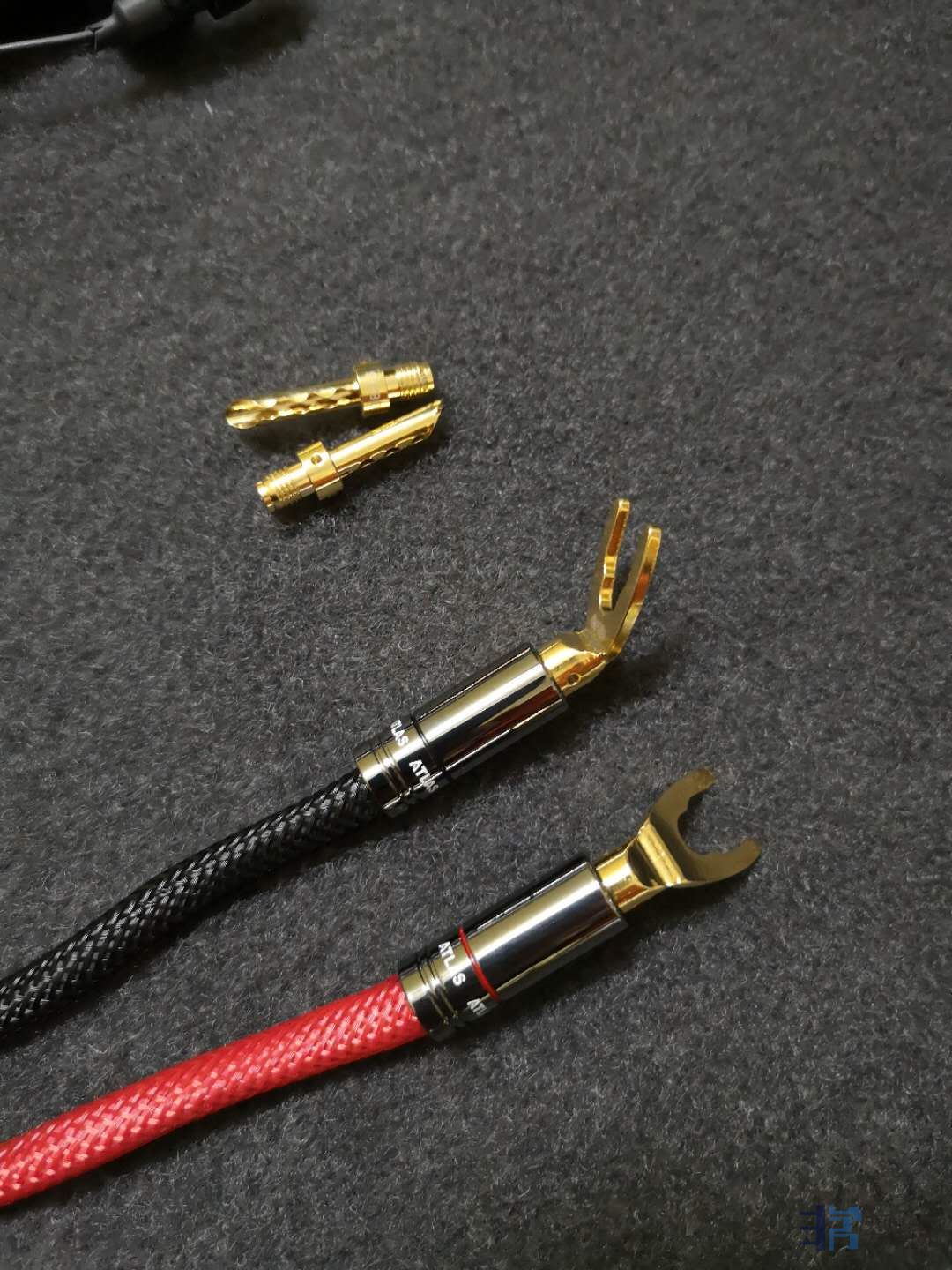 这种情况下,喇叭线选择范围一下子缩小了很多,最好用两头可拆卸的品牌。在我以往调音案例中,Atlas Mavros给我留下了良好的印象,兼具乐感、流畅性、密度、控制力等各项要素。同属欧系的声底又不会破坏爱诗特浓天生的乐感,这也是我在给这套系统配线时特别在意的。最重要的是,他的接头可换,不过出厂时两头都是同样的配置。在这次案例中要特别感谢Atlas总代泽森公司的黄经理,他在得知小毛做样板房项目后,特别配了4颗Y插,才使得喇叭线能顺利使用。