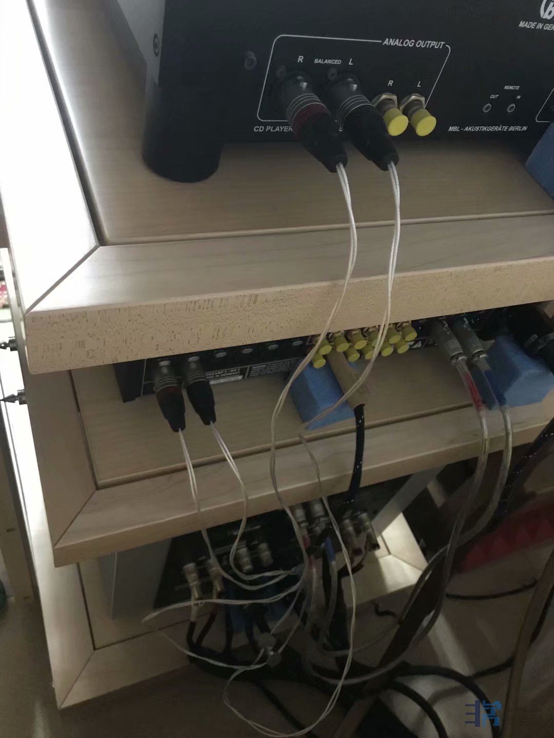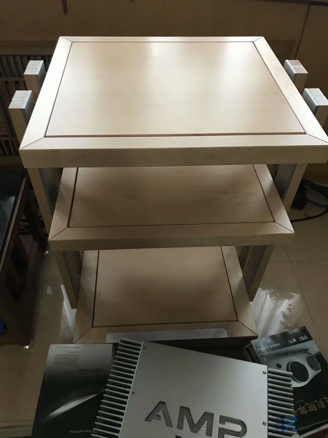 这期间我朋友北方再次偶然在闲鱼上看到上海烧友有出二手原装参考系列HD02三层FE枫木原色机架(立柱包木),直接拿下,秒杀,上海烧友也是两套FE机架,一套德国原装FE三层机架,一套广州复刻的山寨FE三层机架,上海烧友告诉我朋友北方,山寨和原装外观接近,但是效果差距巨大,朋友北方因为运输费用问题,没有买山寨FE,只买了德国原装FE机架。