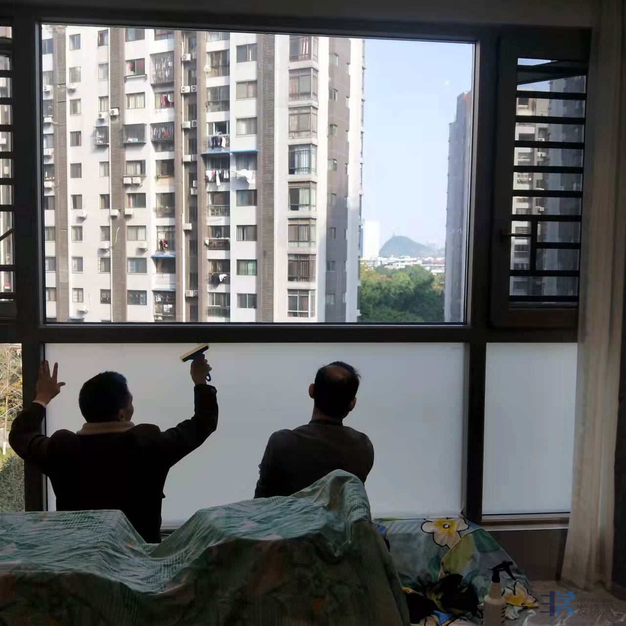 第一步:客厅落地窗包括窗扇全部贴上保护膜,3M白磨砂膜,这一款膜没遮光功能,没挡紫外线功能,没保温隔热的功能,这一切的功能都没有,我只有一个要求:遮挡视线,双向遮挡隐 私!同时耐久。客厅里面无论怎样折腾,闹得天翻地覆都不让人在看见,眼不见为干净!我也不希望有碍于观瞻,影响整栋楼的建筑形象。