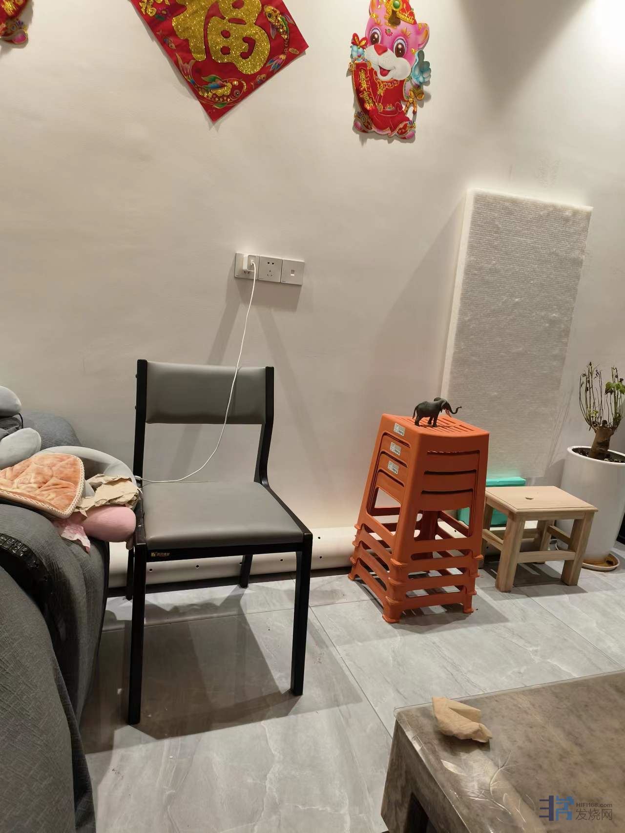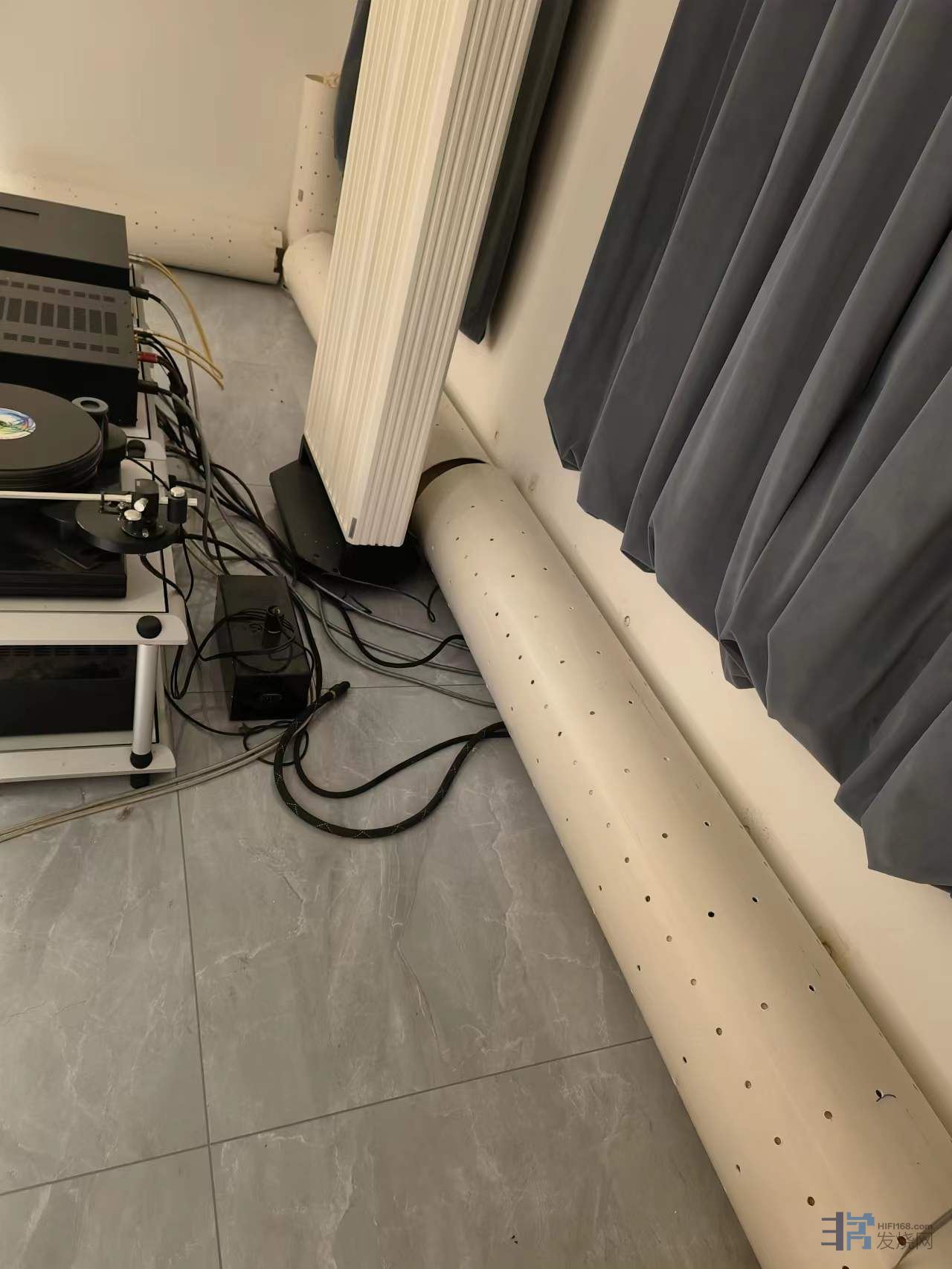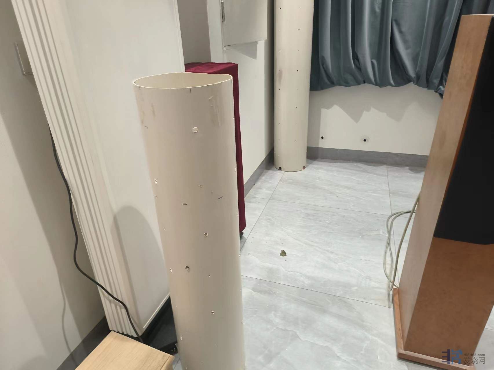 5、竖直放置的排水管,下部开槽,除了留出三个或者四个脚站稳之外,其余全部开槽,高度30~60mm,里面放一个厨房洗菜沥水用的多孔塑料篮子,把吸音棉抬高,离地顶起来,至少不低于开槽的高度,不让吸音棉在正立面露出来,可显著提高吸收低频的效率。我的体会是仅此一点提升音质的幅度不低于升级贵价线材。