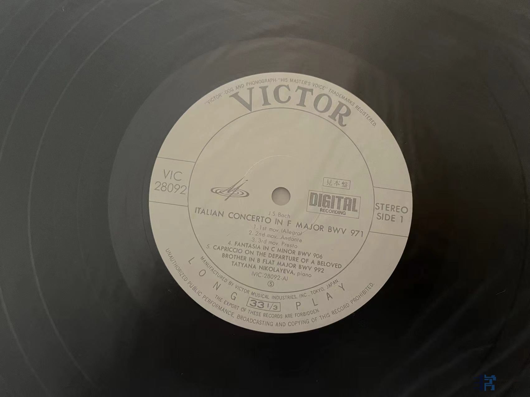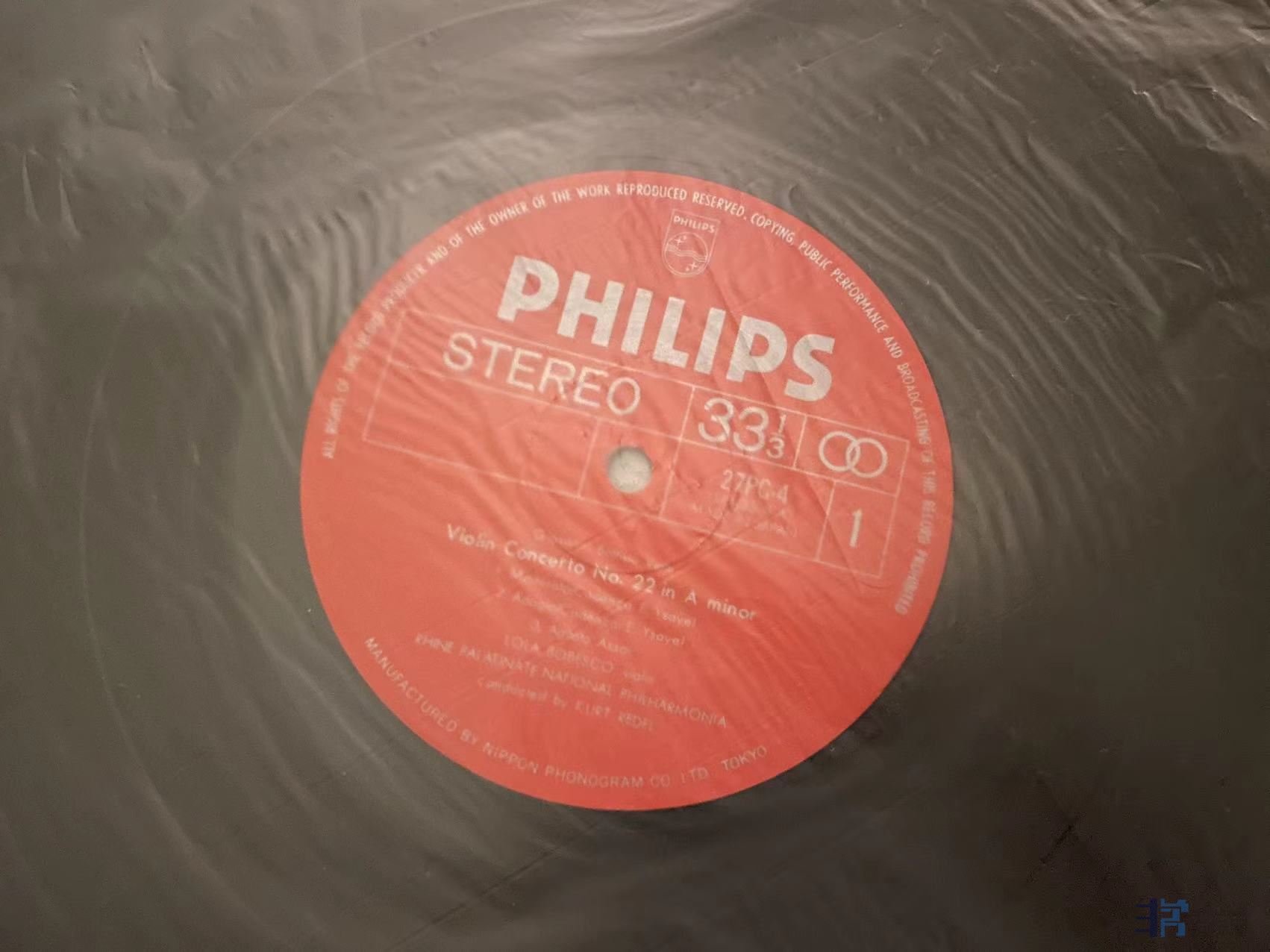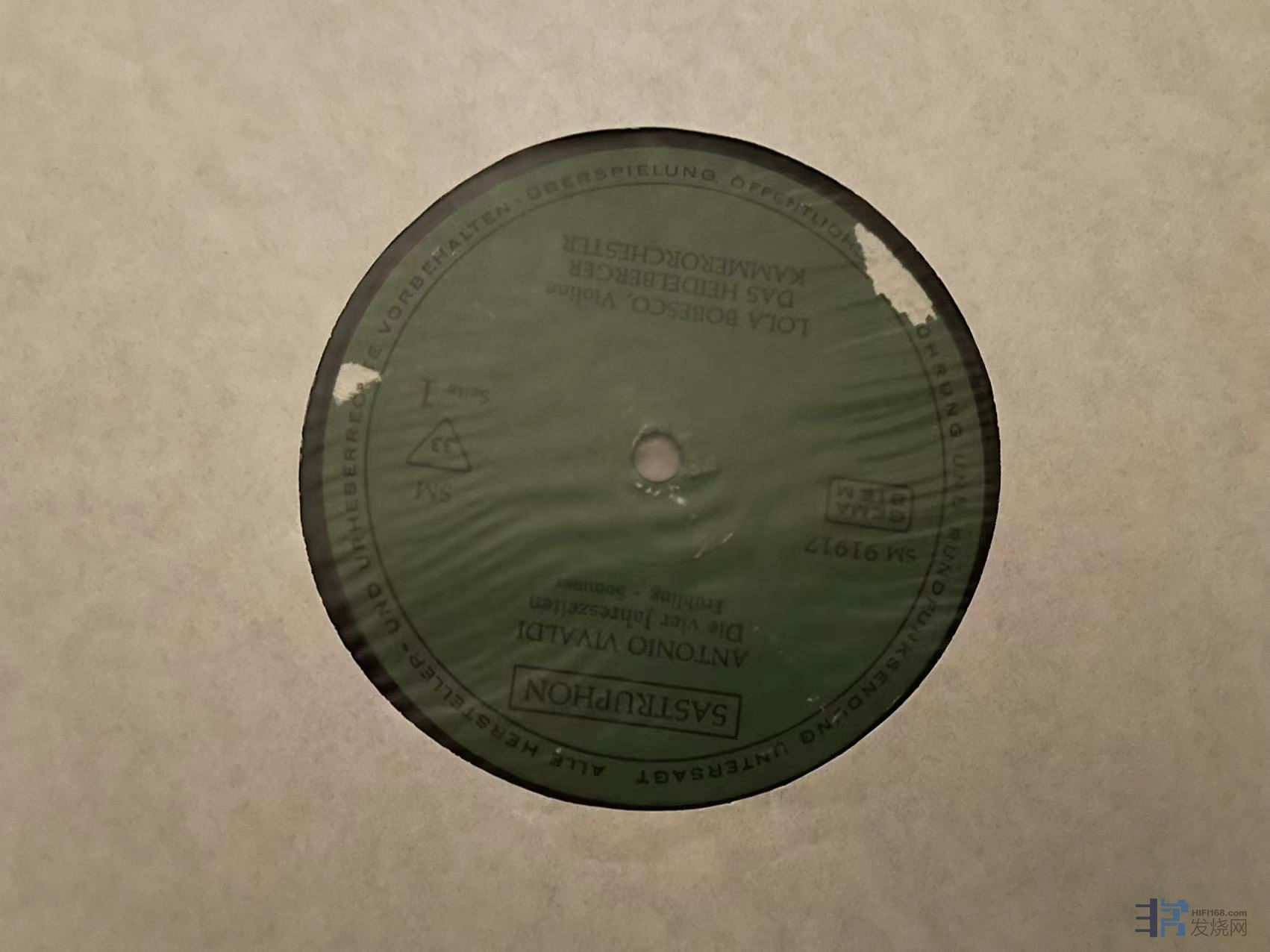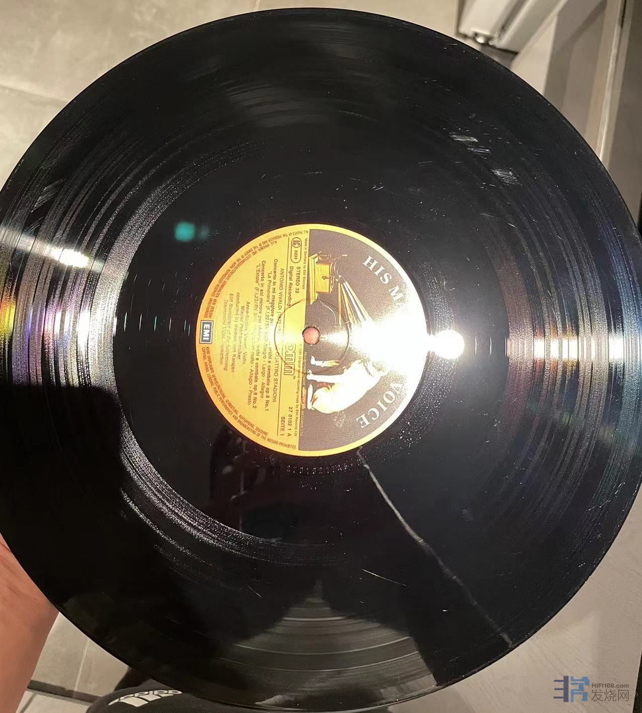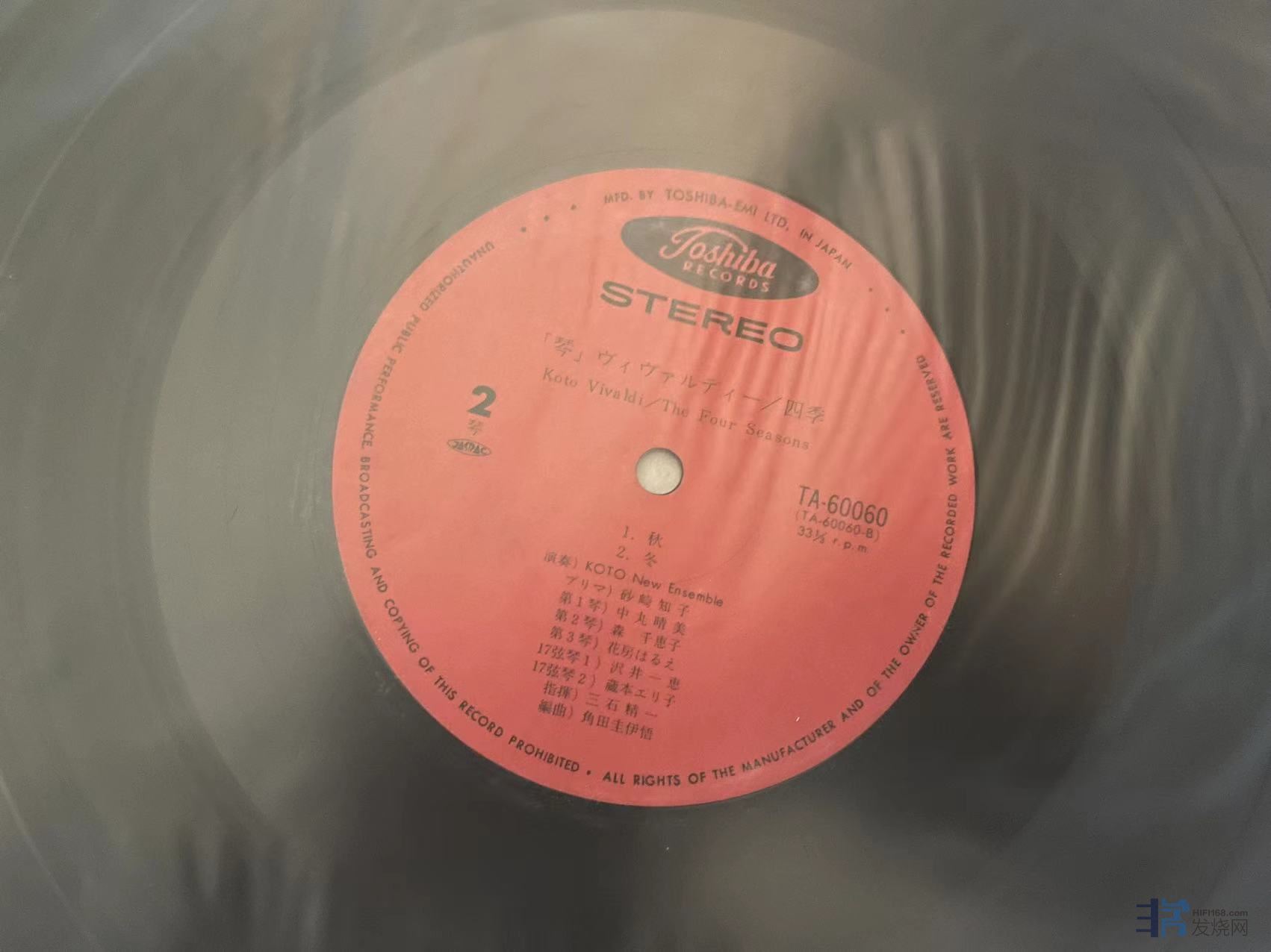 TAS上榜名盘,维瓦尔第四季,新古筝合奏,三石精一指挥,非常有趣的唱片,日东芝首版,有两条强光下可见的痕迹,稍长,在特定角度可见如图摩痕,清理实播还不错,成色EX。 160元(已出)