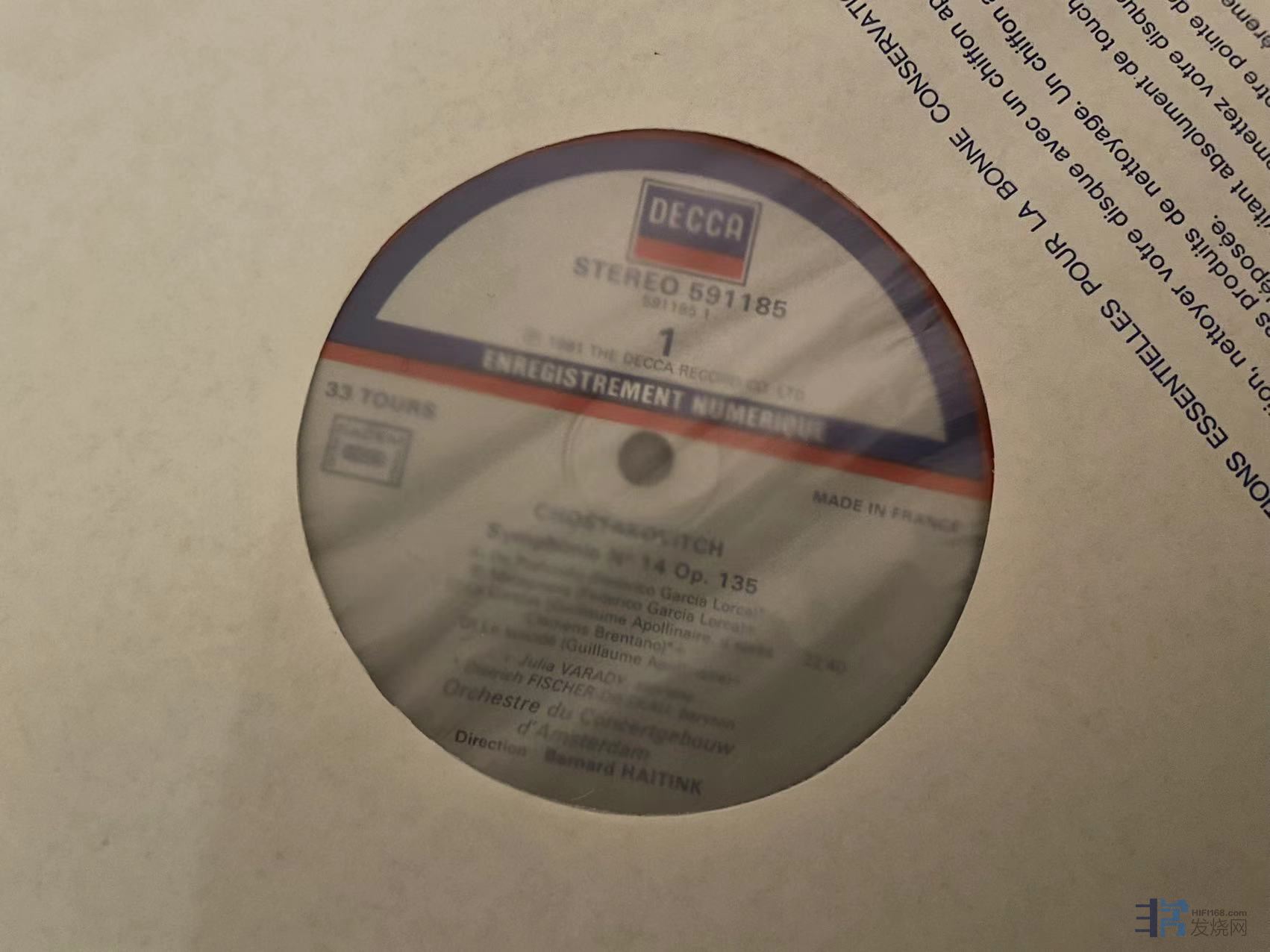 海廷克(Haitink)指挥肖斯塔科维奇第14交响曲,法国首版,唱片整体成色不错,可以就是强光下可见有轻微针痕如图,实际播放影响极小,成色NM-/EX。 220元(已出)