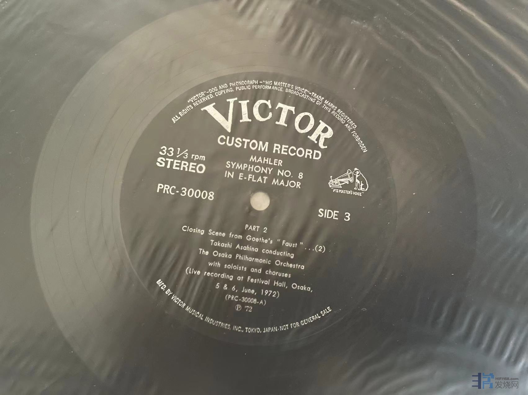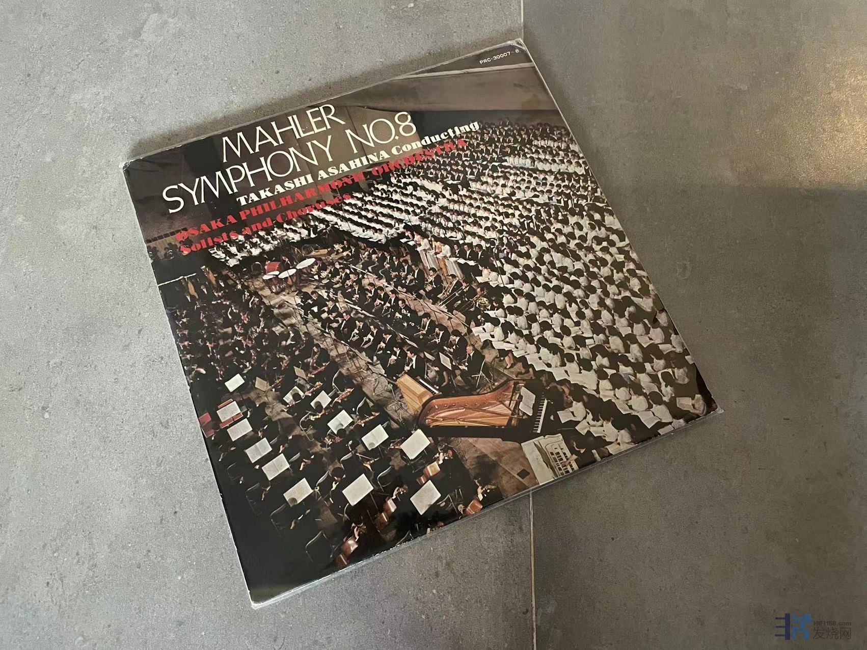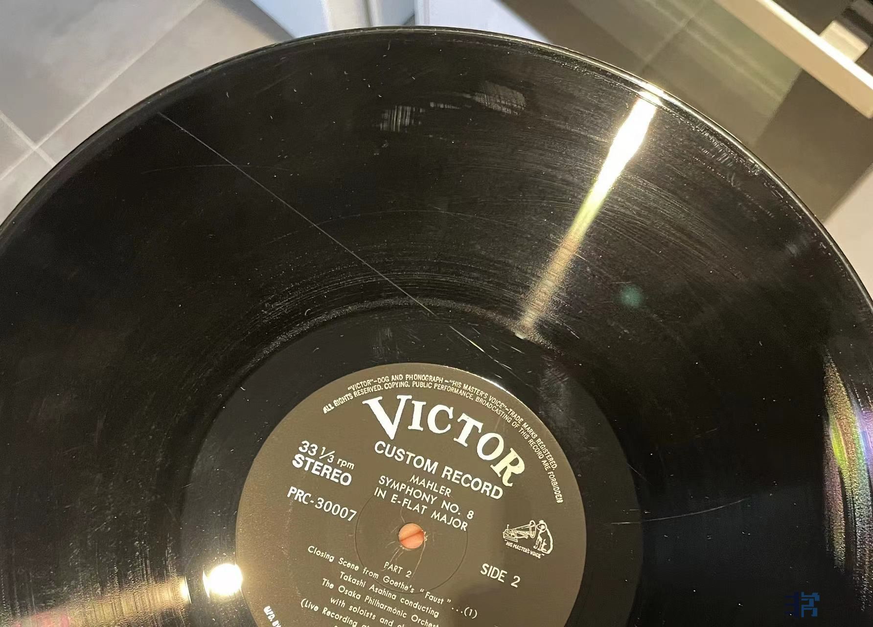朝比奈隆指挥马勒第八号交响曲,重手厚盘,有两面有发丝长痕如图,2LP,成色2NM/2EX-。特价100元(已出)