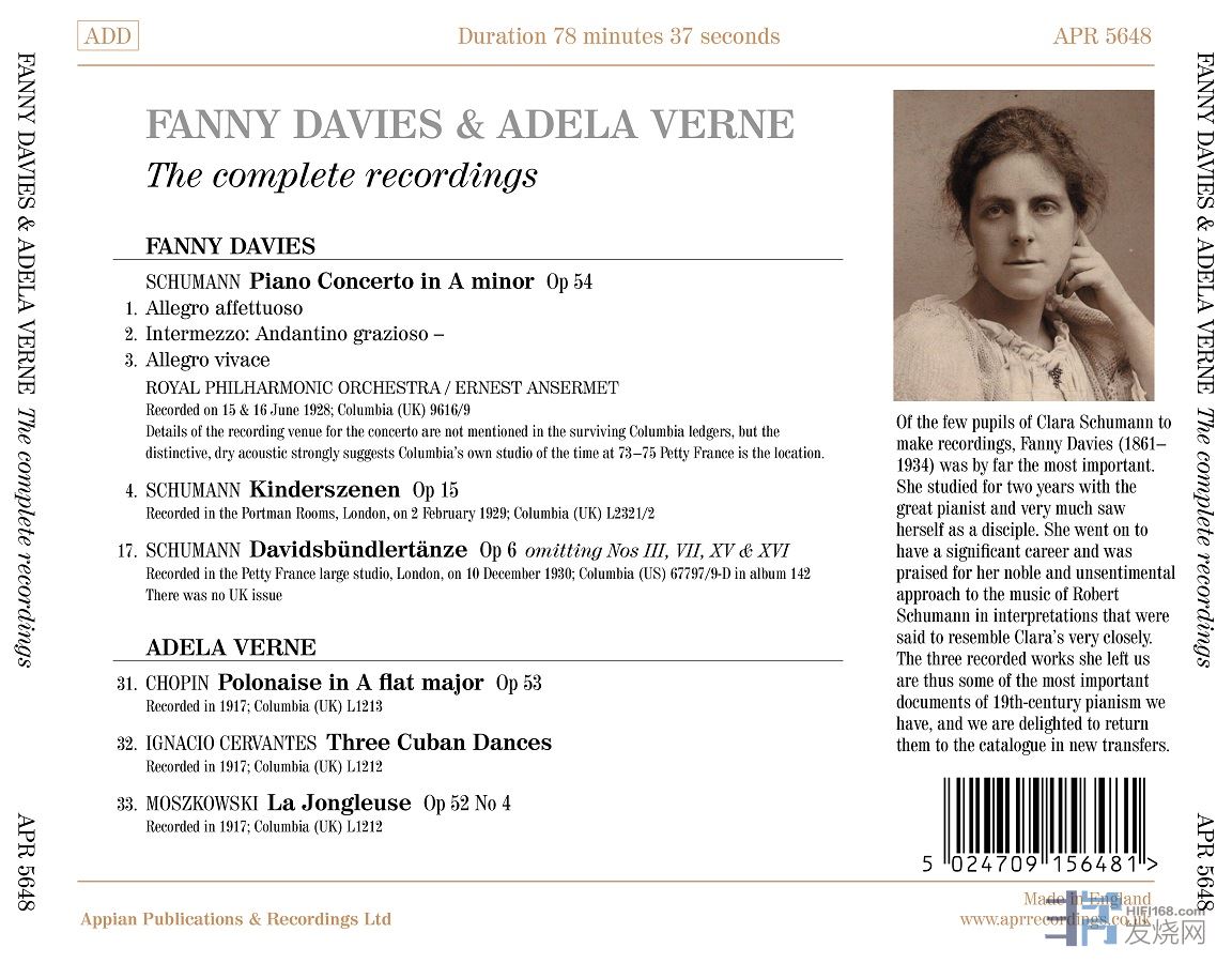 中、小古典廠牌 新品& 銘盤CD簡報APR 十月新品 搶鮮知APR5648 <舒曼夫人得意門生稀有錄音>APR5648<*F. Davies & **A. Verne鋼琴錄音全紀錄 >l 珍貴完整輯錄舒曼夫人兩位門生錄音*曲目 舒曼: 鋼琴協奏曲( 安塞美 指揮 英國皇家愛樂)/ 兒時情景(op.15)/ 大衛同盟舞曲(op.6)**曲目 肖邦: 波蘭舞曲(op.53)/ Ignacio : 古巴舞曲/ /Moszkowski: La Jongleuse (op.52, no.4)l 英國原裝進口,原始母帶精心轉製