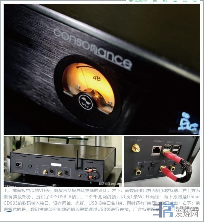 我们首先来看看它的外观以及接口,前面板左侧是吸入式的CD仓,中间是圆形的VU表,右侧是显示屏幕以及操控开关。所有操控开关选用了复位式钮子开关,除了让整机外观更加和谐之外,使用起来也更具操控感。背部提供了RCA和XLR的模拟输出接口,而数码接口方面则比较特别,上方为数码播放部分,提供了4个USB-A接口、1个千兆网线接口以及1条Wi-Fi天线;而下方则是Linear CDS33的数码输入接口,设有同轴、光纤、USB-B接口各1组,同时还有1组同轴数码输出。值得留意的是,数码播放部分和数码输入需要通过USB线进行连接,厂方特别配备了一条经过专门设计的银合金USB线,当然,用家也可以使用更高级的线材进行连接,也可以拔掉此线外接电脑进行播放,可玩性非常高。