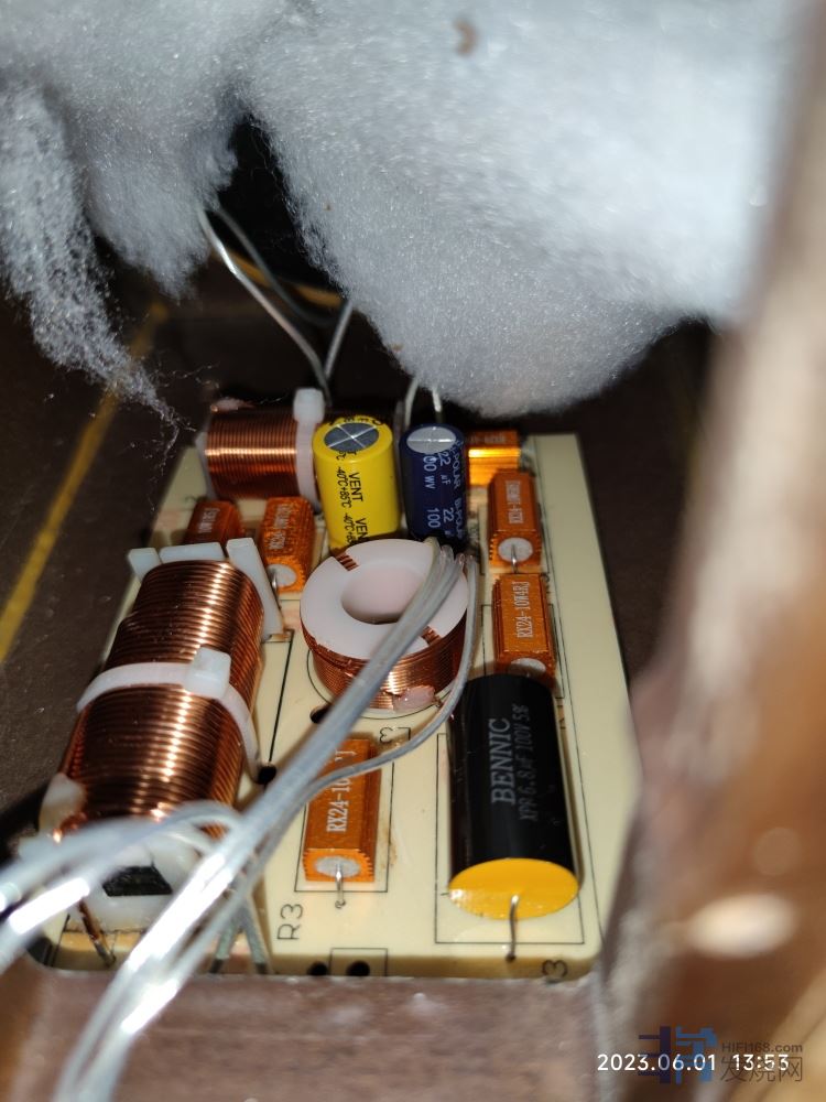 另一个升级的地方是分频器,换了更好的电阻。原来用的普通的水泥电阻,新的分频器采用了黄金铝壳无感电阻(非黄金,是氧化后的颜色),新的电阻具有更好的热稳定性。其它地方依然没变,仍然是Bennic的XPP电容做为高音分频电容。低频分频电容用的Bennic的B03级无极性电容为主回路低音分频电容,这是他家最好的低音分频专用电容了(就是照片中**那个,另一个是B04级的)。电感统一用的专门定制的手绕电感以保证电感的精度。顺便一说,NS15分频点设在了2500Hz,并且分频仅采用2阶。算是自己音箱中最简洁的了,原来都不好意思露,怕喜欢数元件个数的网友笑。不过看了某些到处碰瓷的音箱后,感觉自己的要复杂多了,而且贵了都不知道多少倍了,笑!