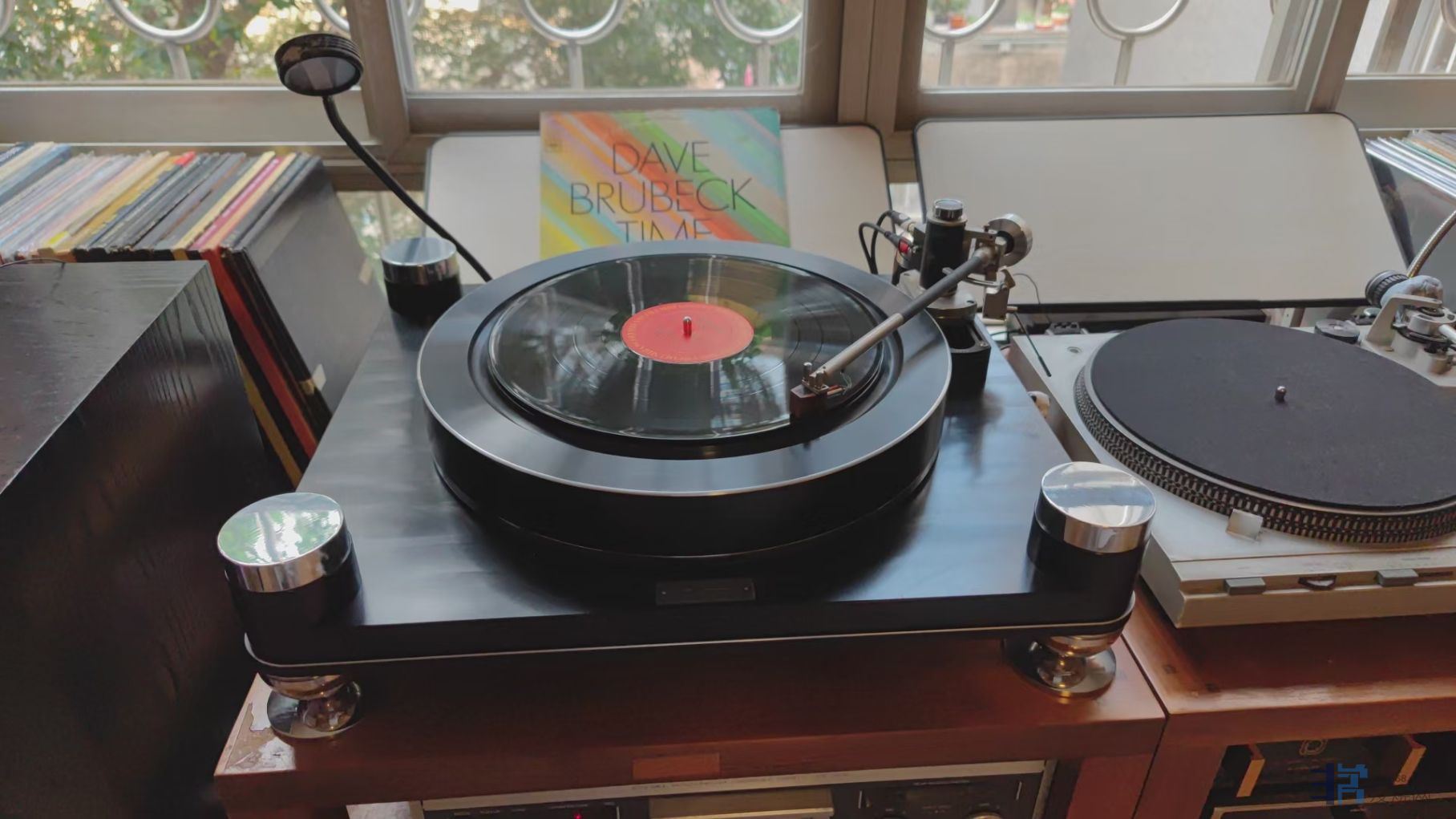 第二天下午广州烧友过来试听唱放,带了超低输出0.2MV的高度风SPU唱头和升压牛过来试听,只好找出老松下直驱唱机来搭配,唱头自重30克,针压3克,只能找蓝丁胶和铝合金垫片来增重