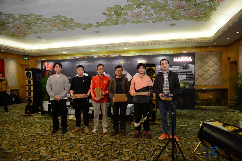 冼公子小KEN给大家抽奖。幸福。真巧,同坐一排有华南农业大学来的两位大学生发烧友,还真被抽中了,相位传真送岀的5条极品电源线,幸运奖品。