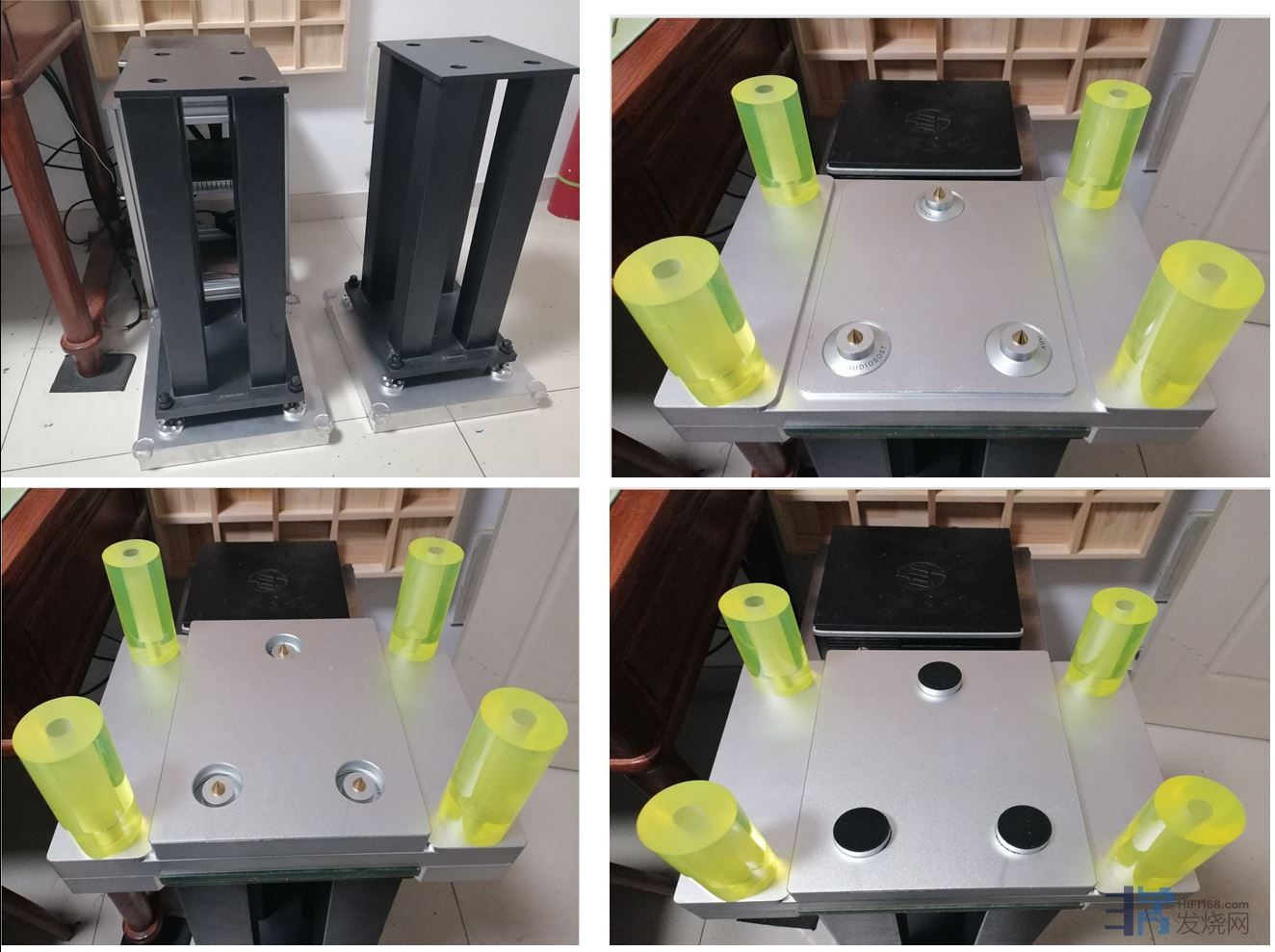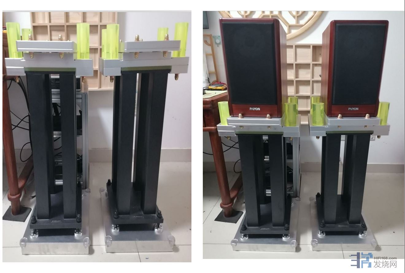 把书架箱的脚架避震作一下 才有铝合金6061 材质 两个脚架重达整体100公斤 包括了整个脚架的底座垫板