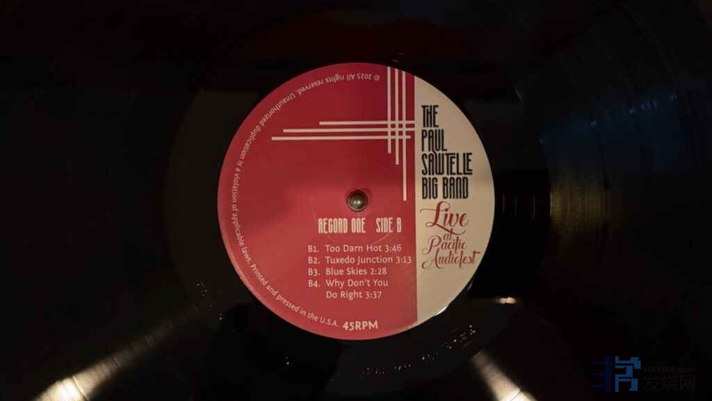 源自这两届音乐会暨录音现场的唱片,于 2025 年正式发行。这是一套超高端的One Step直印工艺 180 克 45 转双张黑胶唱片套装,专辑名称为《The Paul Sawtelle Big Band Live at the Pacific Audiofest》。