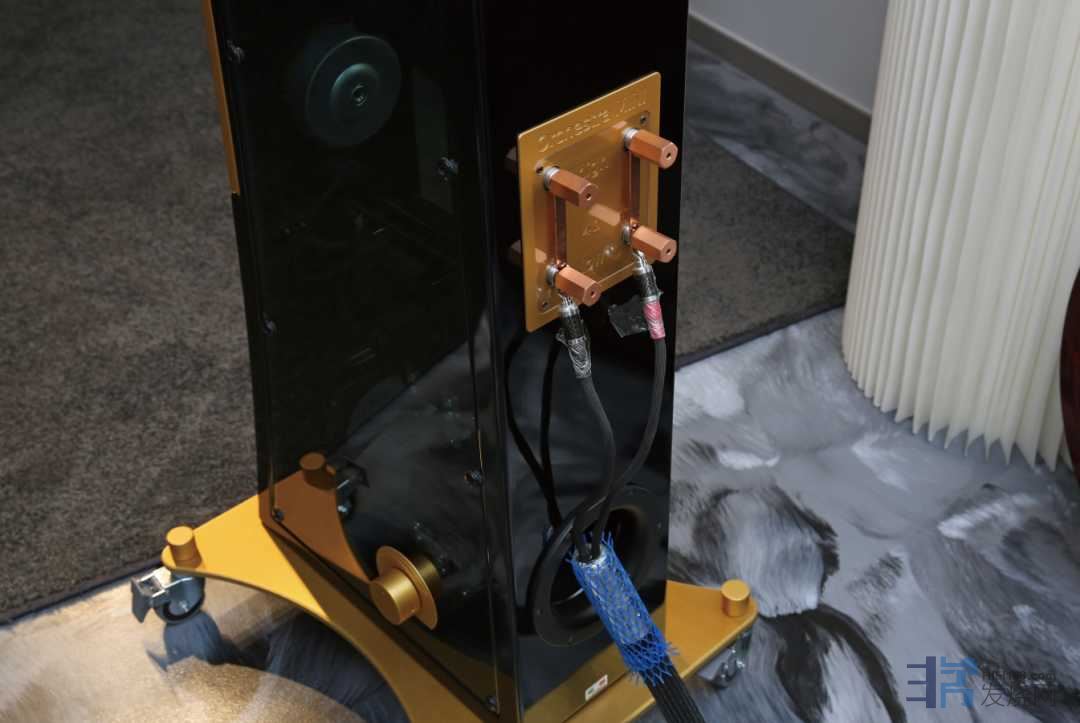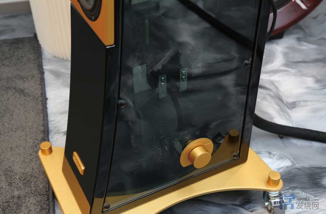 上次欣赏Orchestra座地式音箱,给人最大的直观感受就是“透明箱身”,音箱内部用料一目了然。在次一级的Orchestra Mini身上,同样如此。和Orchestra座地式音箱如出一辙,通过Orchestra Mini箱体两侧的透明玻璃可以看见内部纵向排列的加强筋,以及安装在加强筋上的分频器结构。箱体表面使用钢琴漆涂刷,涂刷工艺比较复杂、成本较高、价格也比较贵,但漆膜光亮、丰满,有极高的装饰功能。细究之下,Orchestra和Orchestra Mini箱体所用的材料名为okoumè。这是实心胶合板和钢化玻璃两种不同材料的结合,前者作为音箱箱体基本框架,后者则是透明的箱体侧板。木制框架和玻璃侧板的结合是通过插入一个特殊的半泡沫密封件来实现,通过该密封件,玻璃在特定的压力(电子测量)下被螺栓固定在木材上。通过这样的方式耦合,以相互抑制共振运动,并将其重新定位到频域。在箱体中使用玻璃材质,Atomica除了对声学上进行深入考究,也是他们对自己工艺的绝对自信。