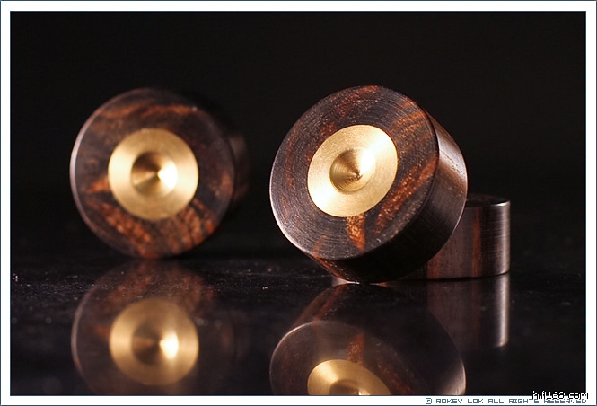 也许这是因为紫檀木的缘故,几个脚垫沉甸甸的,互相击打有金石的铿锵声;也许是中间的那个小白点的改善,这个据说是海阳的较音手法,我也不想仔细追究,有效果就好,自己满意就好。惟一不足的是:脚垫打磨得过于光滑,垫在地板上轻轻一推容易滑动,建议以后制作时底下一面不要打磨