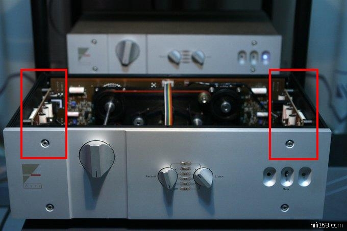 我用的K1的唱放板也是如此,不过是两声道独立的,放在机身左右两侧(如下图红框),如果不装PHONO的话,也是两侧各一块电阻板。