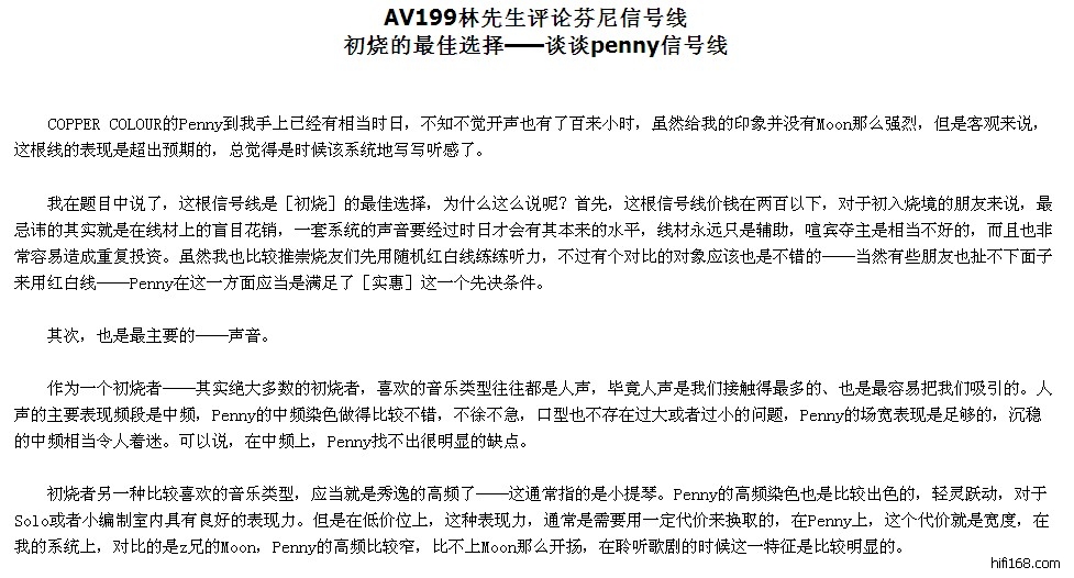 PenNy线收到,听了两天,细节多了不少,声音厚实,低频弹跳感也好! 影音新时代论坛ZY75网友: 看到正在特价的PenNy电源线,就入手了二根,外观很漂亮,深蓝色带尼龙避振网的线身,专定的插头插尾,线身很粗很硬(实在是硬了点,接时费了好大劲) 。拿到线后,没有来得及煲,直接接上系统先听听。这两根线接在我的YMH1500和ELAC 111.2炮上,试的DVD碟是:《雷霆救兵》,第一感觉是这线背景很干净,音场层次分明。比起原来的机线,在声音定位和包围感上好了不是一点点。音场与动态很好,有一种身处战场,战火飞扬的感觉,战争中哪种惨烈的氛围跃上心头。ELAC 111.2炮在速度和低频质感上也有很大提高,原来低频散的感觉不在哪么明显,有了力量,但在量感上提高不大。还有一个明显的变化是子弹呼啸的声音不再刺耳,看来PENNY电源线是一根中性的电源线,高频伸展很好,音场与动态强过机线N班,控制力和背景十分干净。不过是新线,还没有完全煲开,但220元的价格有这个效果已很不错了,期待煲好之后会有更好的表现。希望COPPER COLOUR能设计制作出更多便宜、实惠、优秀的线材.