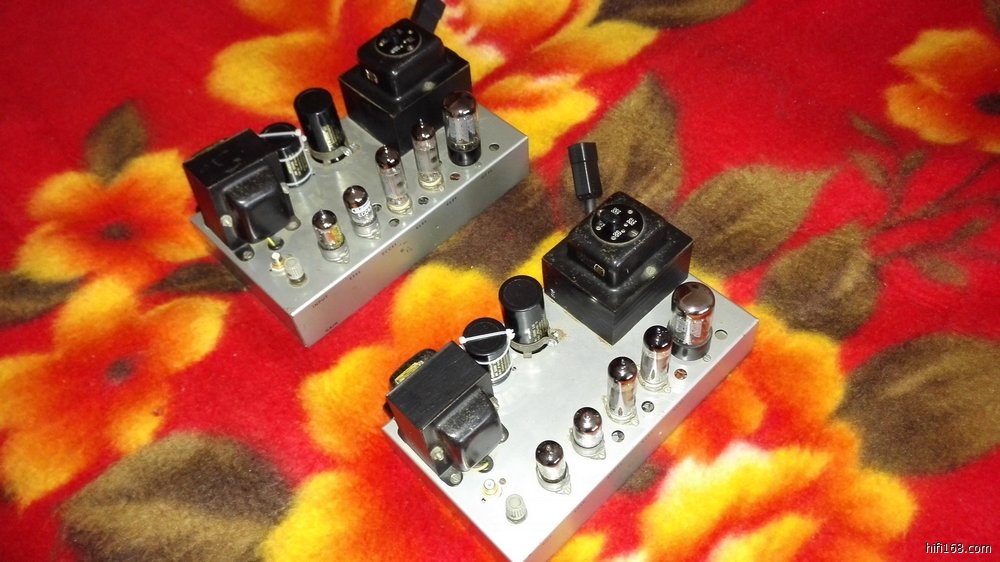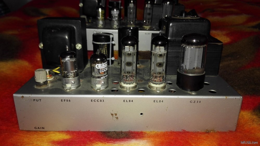 60年代生产 EL84推挽机。功率12瓦,用管EL84*4(早期俄罗斯铁皮环),GZ34(早期黄字大盾)*2,EF86(大盾黄字)*2,ECC83(