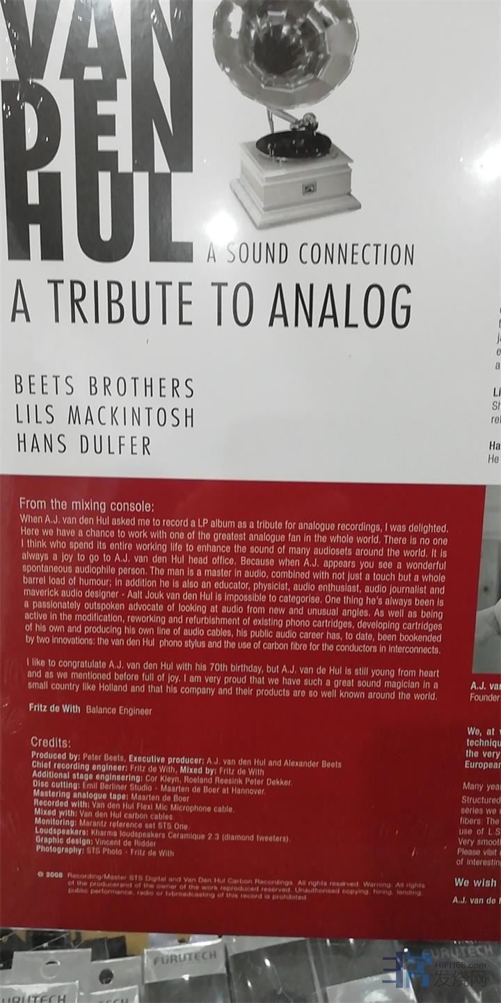 集合A.J.van den hul先生70余年音乐大成于一体(录制,制作时间2008年),本人有幸得到A.J.van den hul先生亲自签名的一张黑胶,一听之后效果惊为天人遂请求A.J.van den hul先生搬出存货,推荐给爱好黑胶的烧友,数量稀少,欲购从速