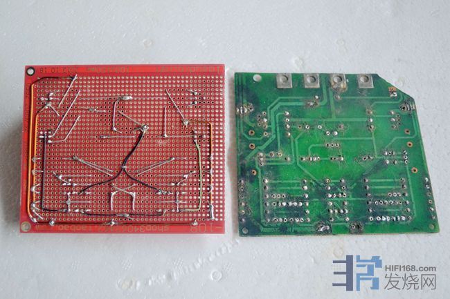 这是本人用洞洞板平面搭棚的顶级用料放大板,对比原印刷电路板,可以看到焊点大幅度减少,接线用上了卡达斯大至尊线芯: