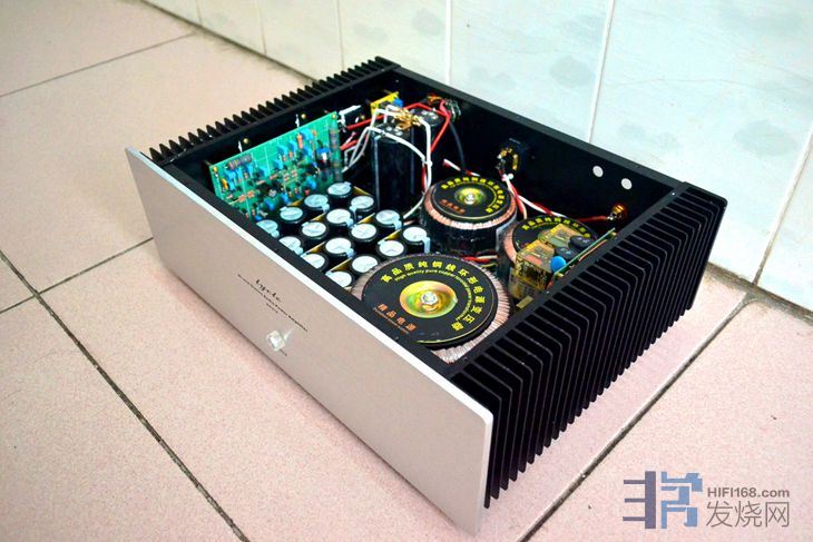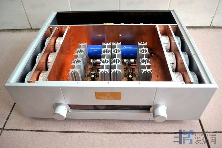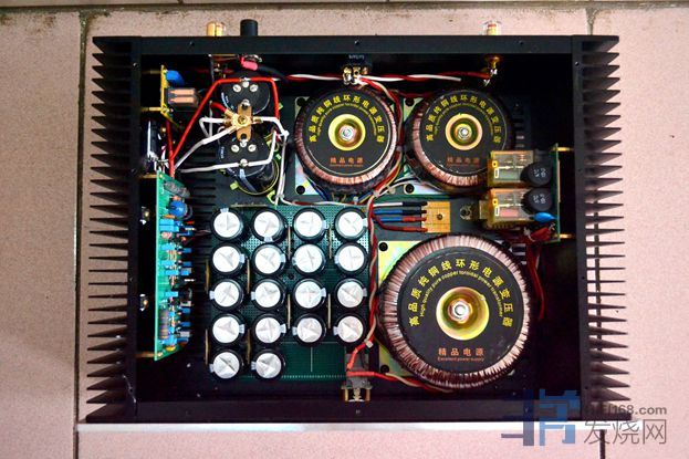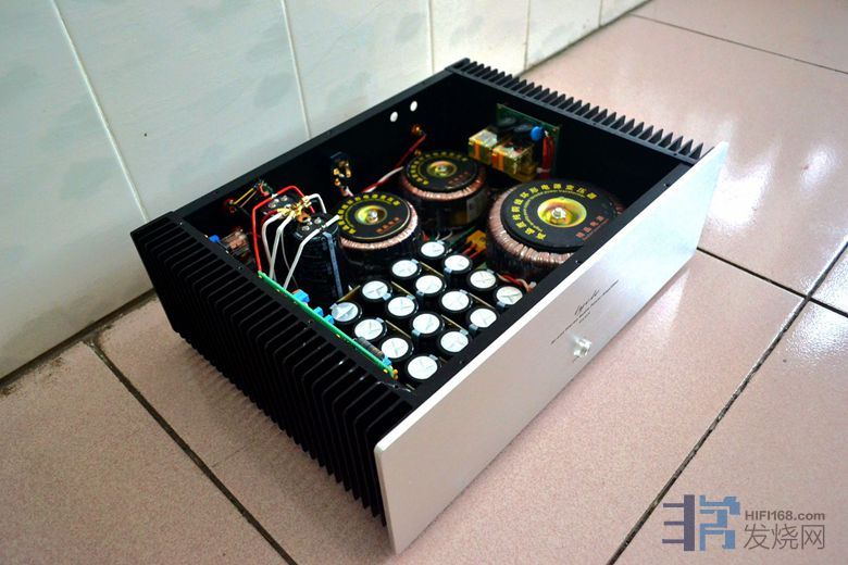 大量使用英国和弦包银线芯,信号线是几十元一米的发烧线。音量电位器为国产贴片电阻步进式电位器,纯铜镀金旋钮,加有纯铜延长杆。功放自带进口美标插头电源线 。使用时请注意电源相位,可用电笔测出排插和功放的火线,对应插上。功放火线如果插到插排零线去,声音会变得单薄和冲。保险丝用的是瑞士舒特,是经过本人正反比对过的,和火零线一样,不要弄反。散热片较小,加了一块紫铜板,即改善散热又起屏蔽作用,机箱底板还加了一块厚铝板做辅助散热。