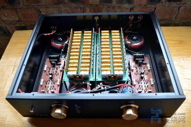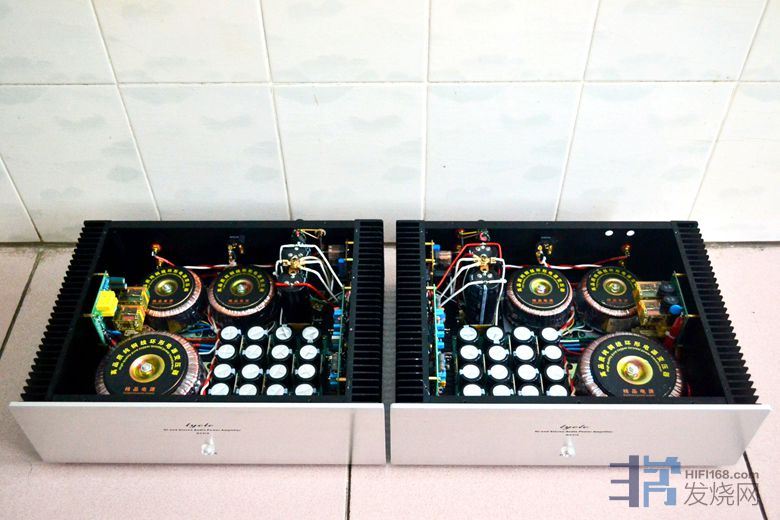 升龙100W方牛2个,出口型25W方牛1个,30W方牛1个,60W方牛1个,总容量315W,15路供电压放大级部分。电流放大级也就是输出级供电为一个120W大厂环牛。机内实际上还有另外1个出口型25W方牛专供输入缓冲级;