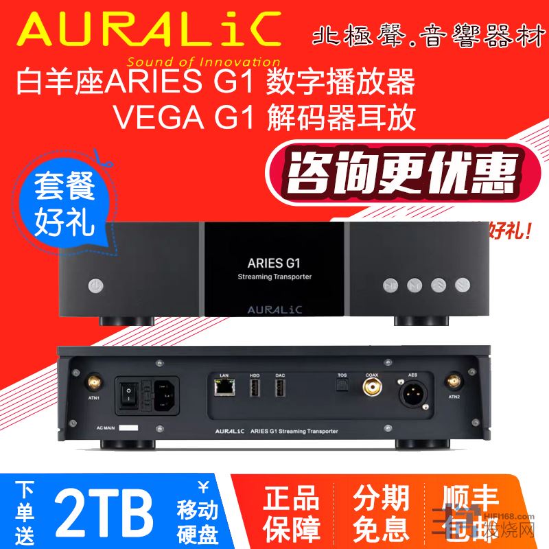 ARIES G1继承了ARIES G2强大运算核心:PCM 32 384 / DSD 512的播放能力、内置双飞秒时钟、AES /同轴 /光纤/ USB 的完整数字输出、有线千兆网络/WiFi5G联网功能、Airplay / Soptify Connect/网络电台/蓝牙 / Tidal / Qobuz / Songcast等多种播放平台支持、完整的LightningServer和第三方DLNA服务器软件支持完美匹配 NAS / PC / Mac OS存储音乐使用,更提供外置USB存储设备文件播放功能,为您提供完善的数字网络播放体验。AIRES G1机箱尺寸为340 x 320 x 80 mm,相对于原有体积小巧且为流线型造型的ARIES,总体积增加2.5倍,有用更佳的电磁屏蔽性能和散热性能,ARIES G1 外观变化差异相当明显,前面板镶嵌的广视角高分视网膜彩屏,可实时显示播放的曲目和进度,不仅方便客户使用,而且还可以浏览聆听内容与进度。ARIES G1采用了双线形电源独立供电设计,这样就能使得音频信号品质达到了一个全新的高度。