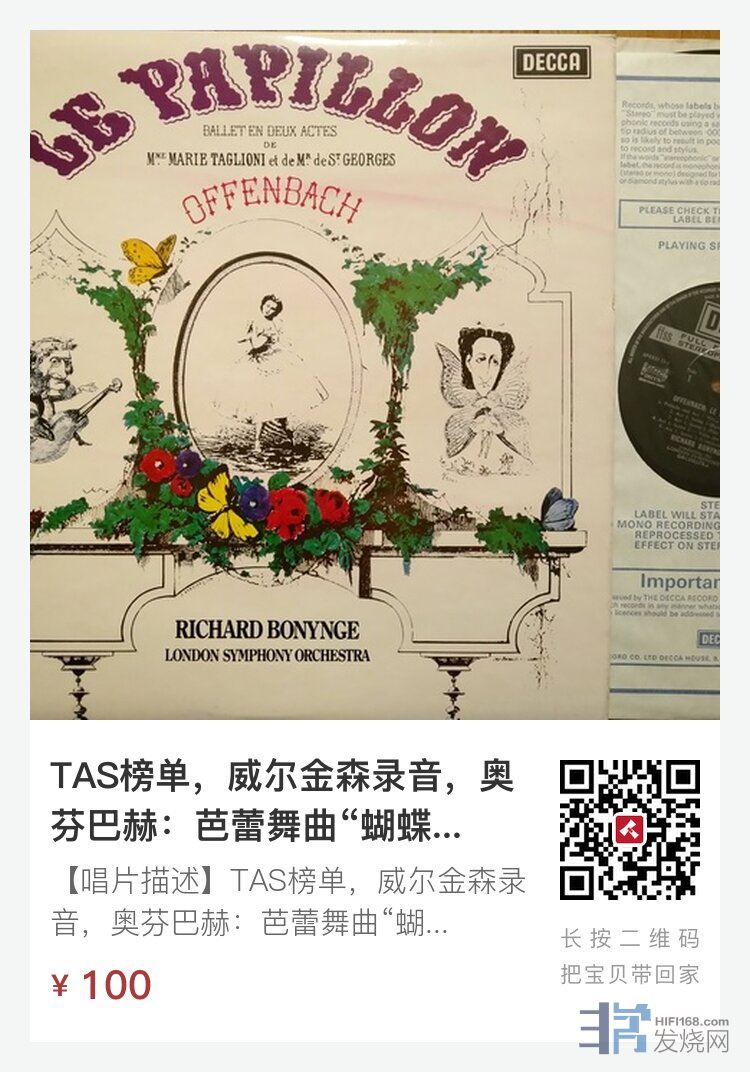 【唱片描述】TAS榜单,威尔金森录音,奥芬巴赫:芭蕾舞曲“蝴蝶”,波宁吉指挥伦敦交响乐团,DECCA英国方标首版,NM