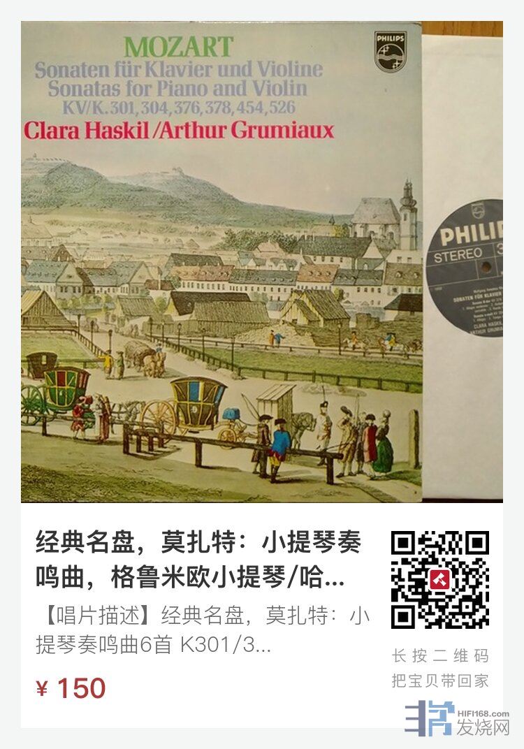 【唱片描述】经典名盘,莫扎特:小提琴奏鸣曲6首 K301/304/376/378/454/526,格鲁米欧小提琴/哈斯基尔钢琴,PHILIPS荷兰蓝银单圈立体声二版,2LP折页装,NM-至NM