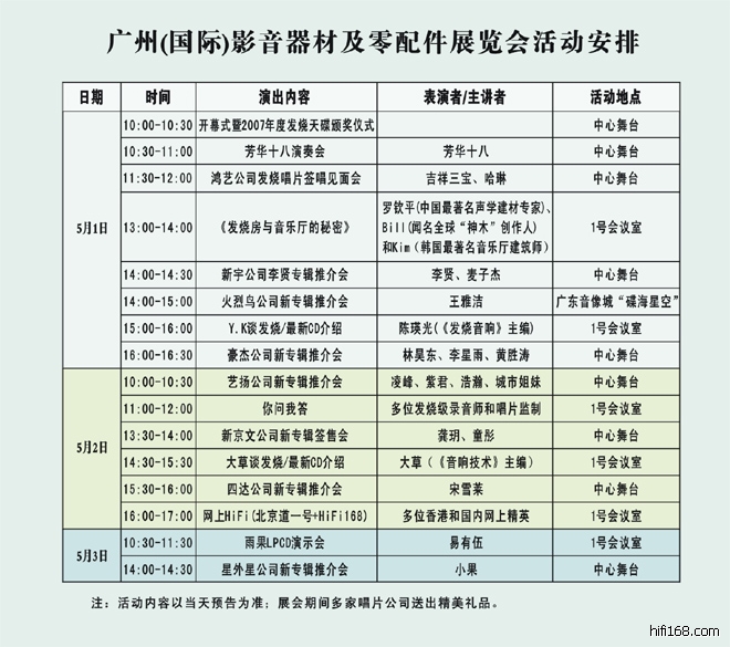 由广东省社会文化管理协会、广东音像城等主办的“广州(国际)影音器材及零配件展览会”将于5月1日至3日在广州市机场路中国国际音像博览会会馆举行。应广大音响(乐)发烧友的要求,展览会的门票将在深圳、珠海、东莞、中山、江门、佛山和阳江等地提前预售,参观者凭票可获赠展会纪念双CD一套。