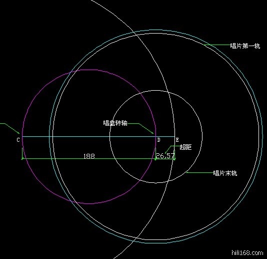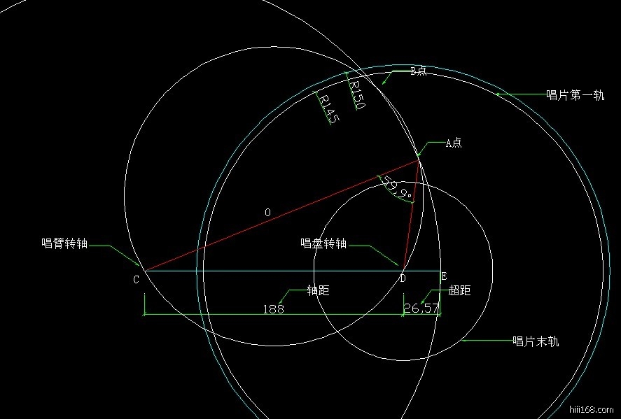 见上图:CD为唱盘和唱臂转轴的轴距,DE为超距,CE为唱臂长度。