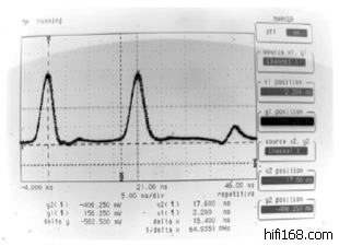 此次测量很难确保精确度,因为测试脉冲需尽可能的窄,否则它会遮掩返回脉冲的起点。测量较窄的脉冲时,应采用音频实验室中少见的特高速示波器。下列波形照片显示,测量时延时