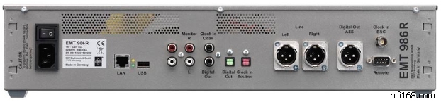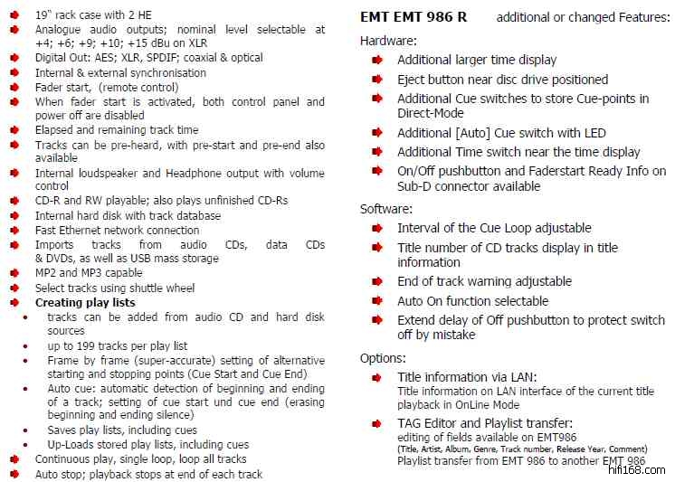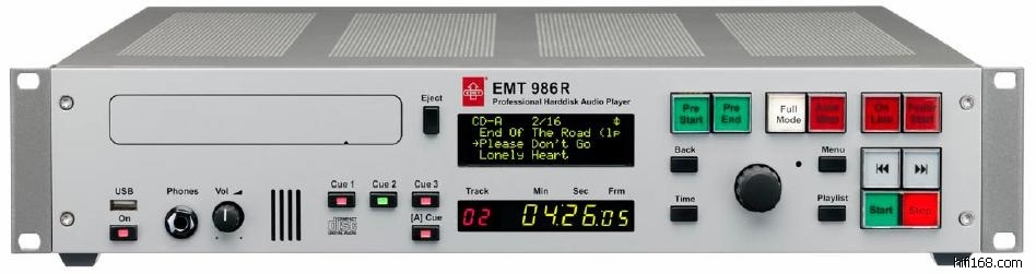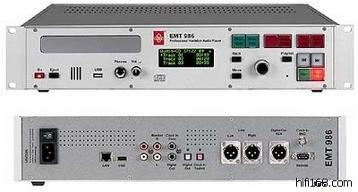 EMT 986R 广播级CD播放器 数码输入:S/PDIF、AES/EBU、Toslink,模拟输出:RCA、XLS(输出增益:+4、+6、+10、+15DB),外接存储设备方式:USB,内置固态硬盘:8GB,尺寸:95*482*375mm,重量:9.6KG,定价:HK$79800