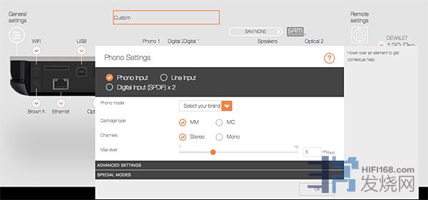 140 Pro有很多连接方式,狭窄的后面板具有丰富的数字连接——分别用于USB、以太网、TosLink和miniTosLink,2个S/PDIF数字接口,还有2个RCA接口可以作为模拟信号输入(线路或者唱头输入)或者可以被设置为2个额外的S/PDIF数字输入。还有一根天线,当然用于Wi-Fi,而不是FM收音机。