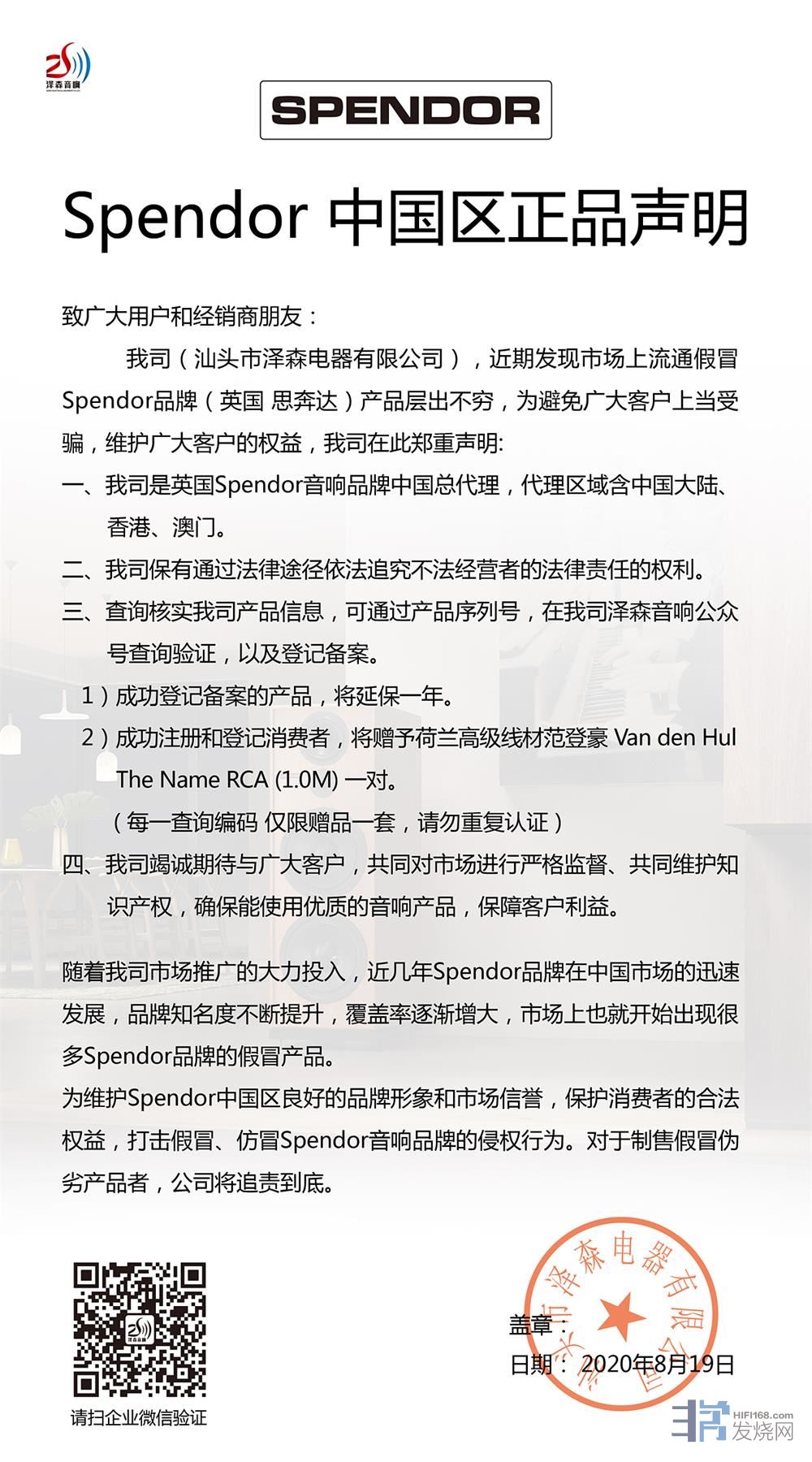 为维护Spendor中国区良好的品牌形象和市场信誉,保护消费者的合法权益,打击假冒、仿冒Spendor音响品牌的侵权行为。对于制售假冒伪劣产品者,我司将追责到底。